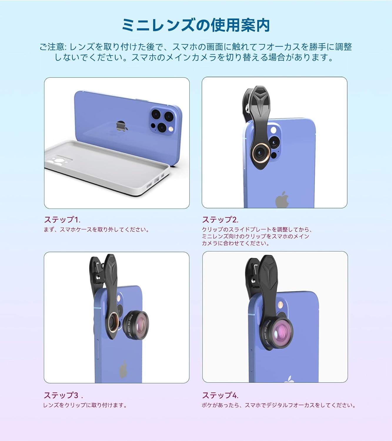 【多機種対応】スマホにクリップを挟むだけで簡単にスマホのカメラに装着でき、ほとんどの平面カメラやタブレットに対応します。クリップのレンズネジリングがスライドできるので、レンズをメインカメラの位置までスライドさせることができます。このレンズセットはiPhone14/iPhone15/iPhone 13/13 pro/12/12pro/11 XS MAXS XS 8 Plus 7 Plus 6、Galaxy 10 Plus S 7 Edge S 7 Edge S 7 Sony Xperia AQUOS senceなどに使用できます。