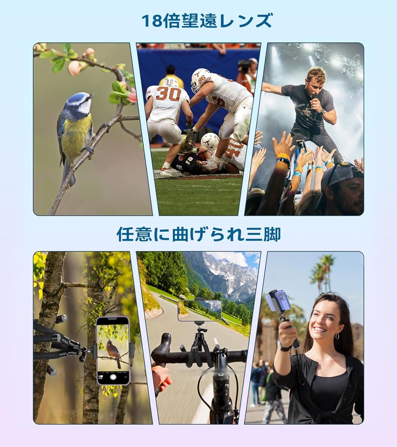 【耐久性のあるスマホ三脚付き】三脚は高密度のゴムコーティングを採用し、より耐久性があり、長持ちします。三脚は任意に曲げることができ、どこでも(角度のあるまたは滑らかな表面)使用できます。旅行中にさまざまな角度で撮影できます