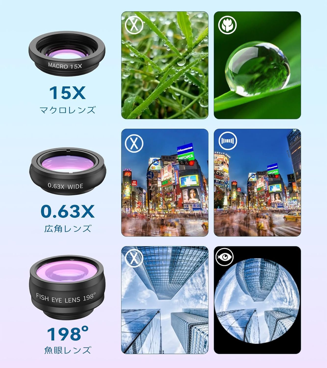 4 in 1スマートフォンレンズセット:4 in 1スマートフォンレンズセットは、レンズ愛好家や専門家向けに設計されています。 18倍望遠レンズ、198°魚眼レンズ、0.63倍広角レンズ、15倍マクロレンズ、フレキシブル三脚、電話スタンド、レンズクランプ、アイマスク、柔らかい布、収納バッグが含まれています。 Apexel は、スマートフォンをプロ仕様のカメラに変えるのに最適な選択肢です。アイマスクは望遠レンズを単筒望遠鏡に変換することもできます。
