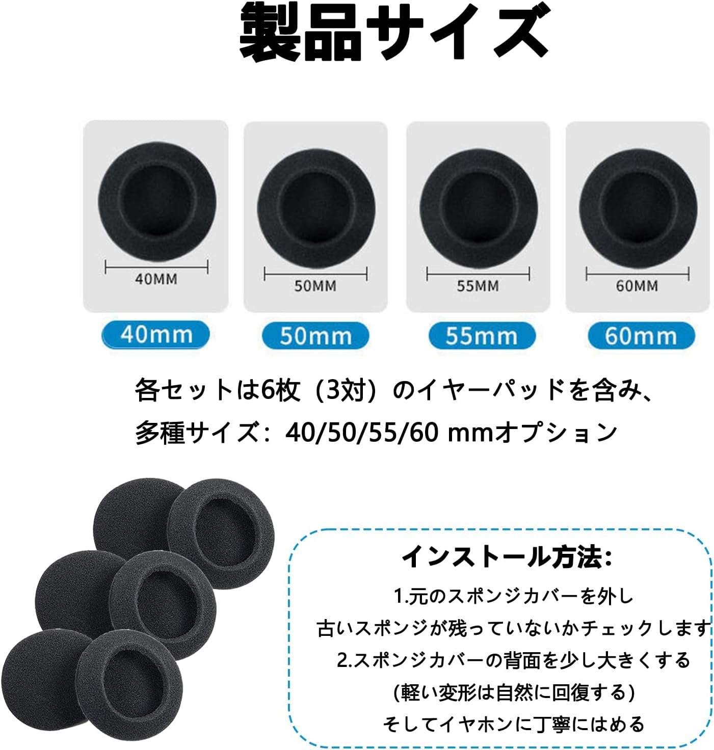 FujiFrugal イヤーパッド ヘッドホンカバー ヘッドホン 交換用イヤーパッド 直径40/50/55/60mm ヘッドセットカバー 3セット(6枚) イヤホンカバー 柔らかい 快適 簡単装着 高弾性 軽い 柔らかい