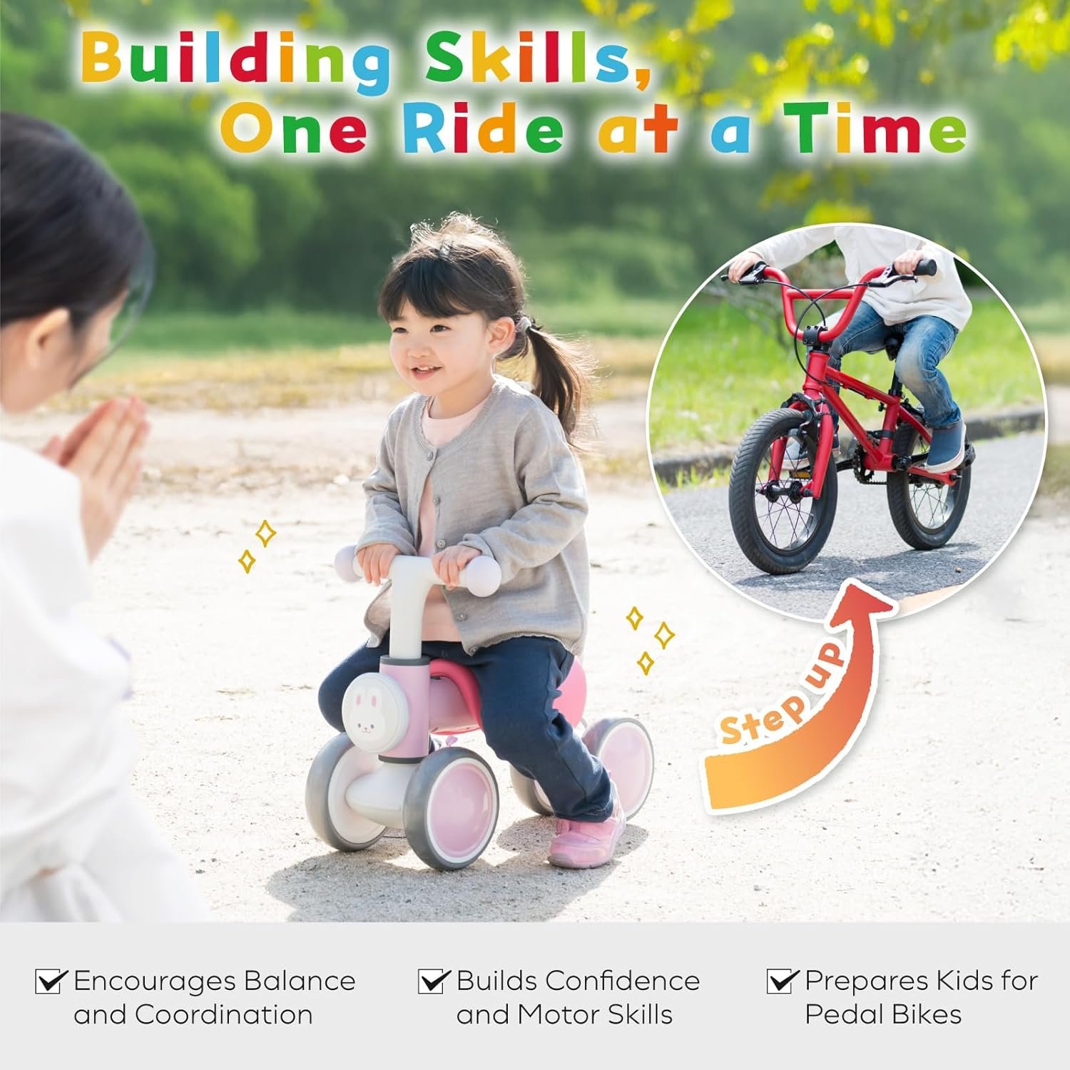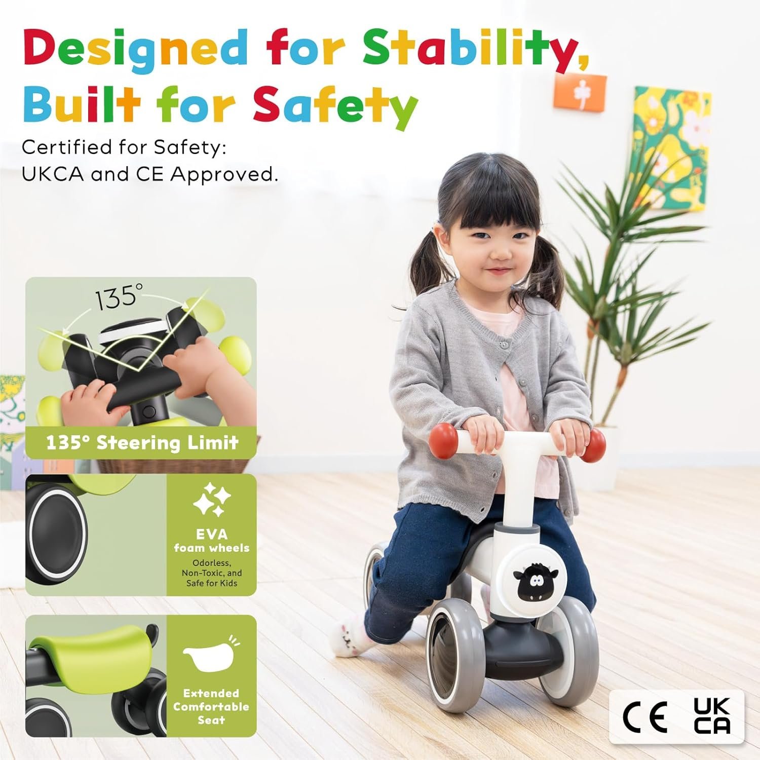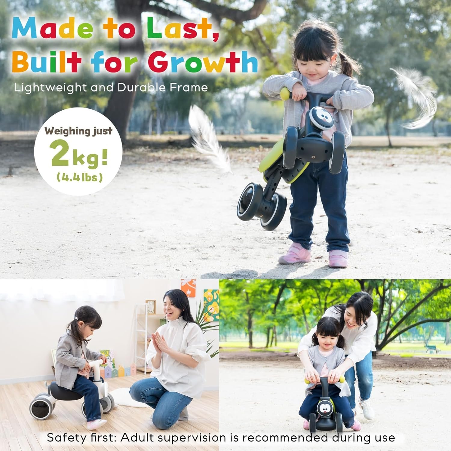 【お子様にも安心設計】高級PUレザーのソフトサドルと幅広シートで1歳のお子様でも快適です。安全なフールクローズホイール設計。床を傷つけにくいタイヤ素材で、屋内でも使用できます。細部まで安全性と快適性を追求した設計で、安心してお使いいただけます