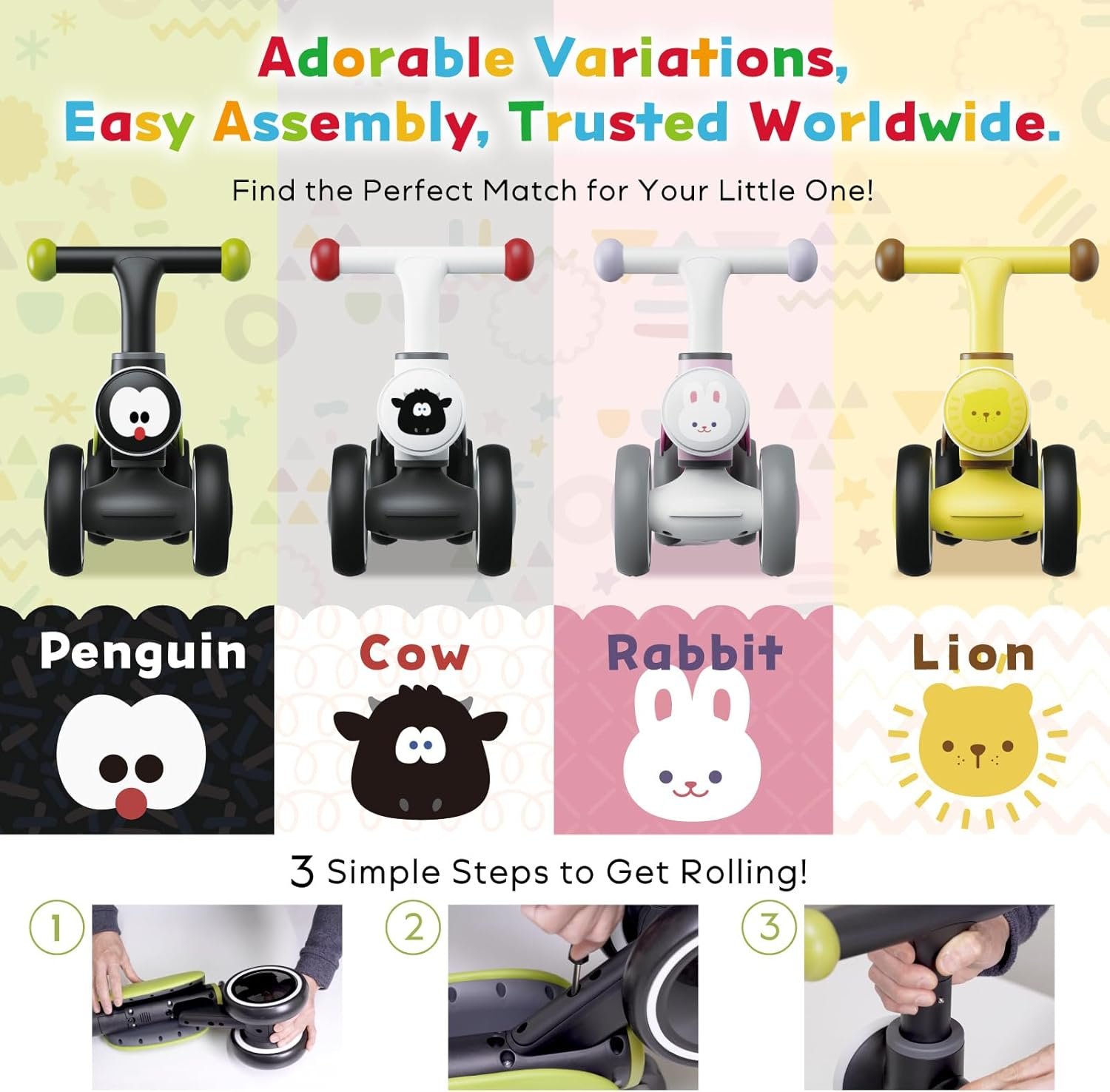 【安定性抜群で安心】ちびっこライダーは4輪構造なので安定性が高いです。三輪車に比べてバランスが崩れにくいので安心してご利用いただけます。タイヤはEVAフォームを採用し、無臭、無毒で床を傷つけないので、室内でも安心して遊べます。別売りの専用バランスボードを使えば、動物たちのゆらゆら揺れも楽しめ、15度の傾斜でバランス感覚を養うこともできます。