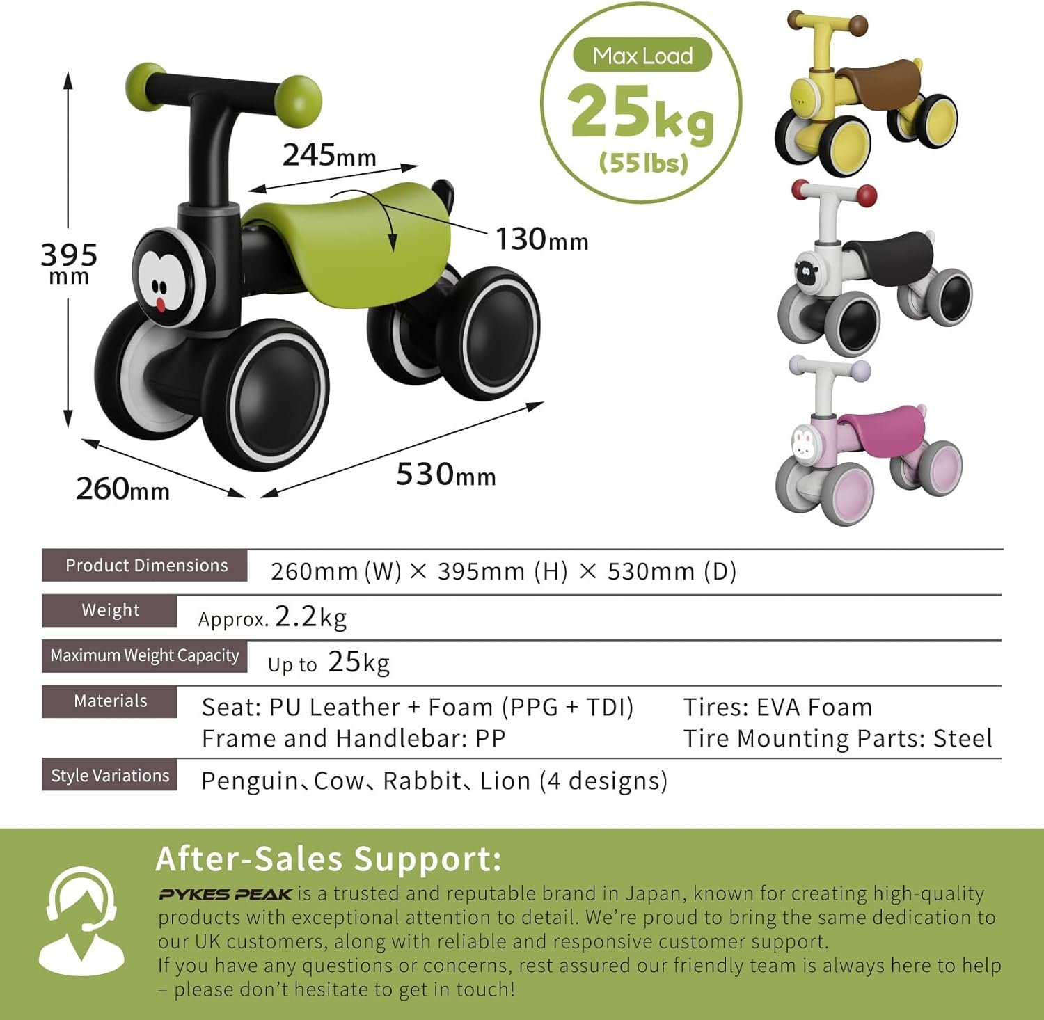 【仕様】サイズ:530×260×395mm重量: 4.5 ポンド (2.2 kg)。最大耐荷重:25kg対象年齢:1歳以上、椅子の高さ:約15cm 10.6インチ(27cm)素材:サドル(PUレザー+EVA)、タイヤ(27cm)タイヤ(EVA)、タイヤ(EVA)、タイヤカプラーメーカー保証付) PYKES PEAK製品は日本国内で販売しております。お客様への対応も日本語で丁寧に対応させていただきます。初期不良や故障の場合は、公式ライン@pykespeakまたはメール「pp@sprt.shop」よりお気軽にご連絡ください。