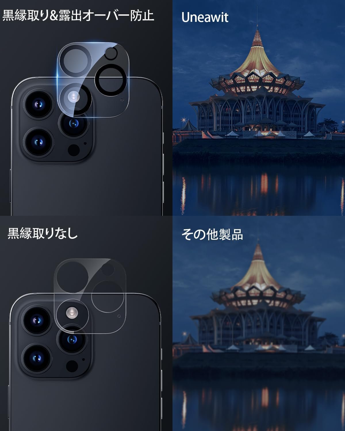 Uneawit このレンズ保護フィルムは iPhone 13 Pro / 13 Pro Max 用に設計されており、9H 強化ガラス、傷つきにくい、電話ケースに優しい、ナイトサークルデザイン、気泡なし、高解像度、夜間撮影に影響しません。