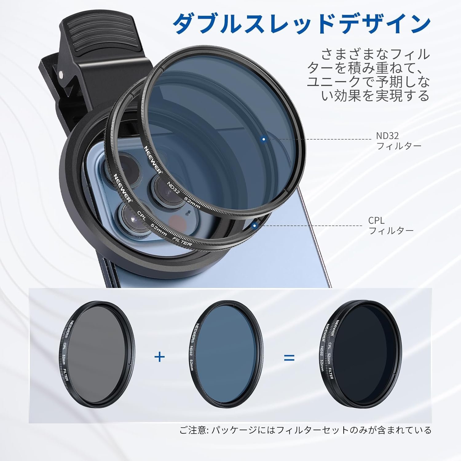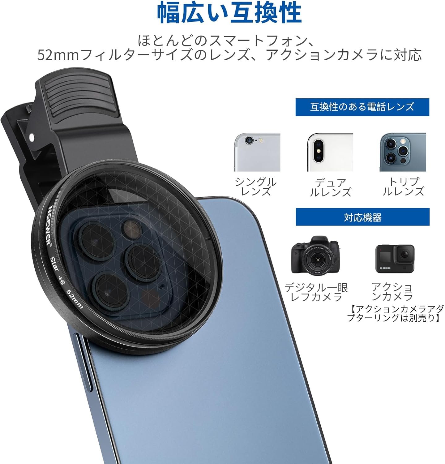Neewer 52mmレンズフィルターセットスマートフォンレンズクリップ + CPL + ND32 + 6ポイントスターフィルター + iPhone 15 14 Pro Max 13 12 11&カメラ用の段階フィルター(4色)