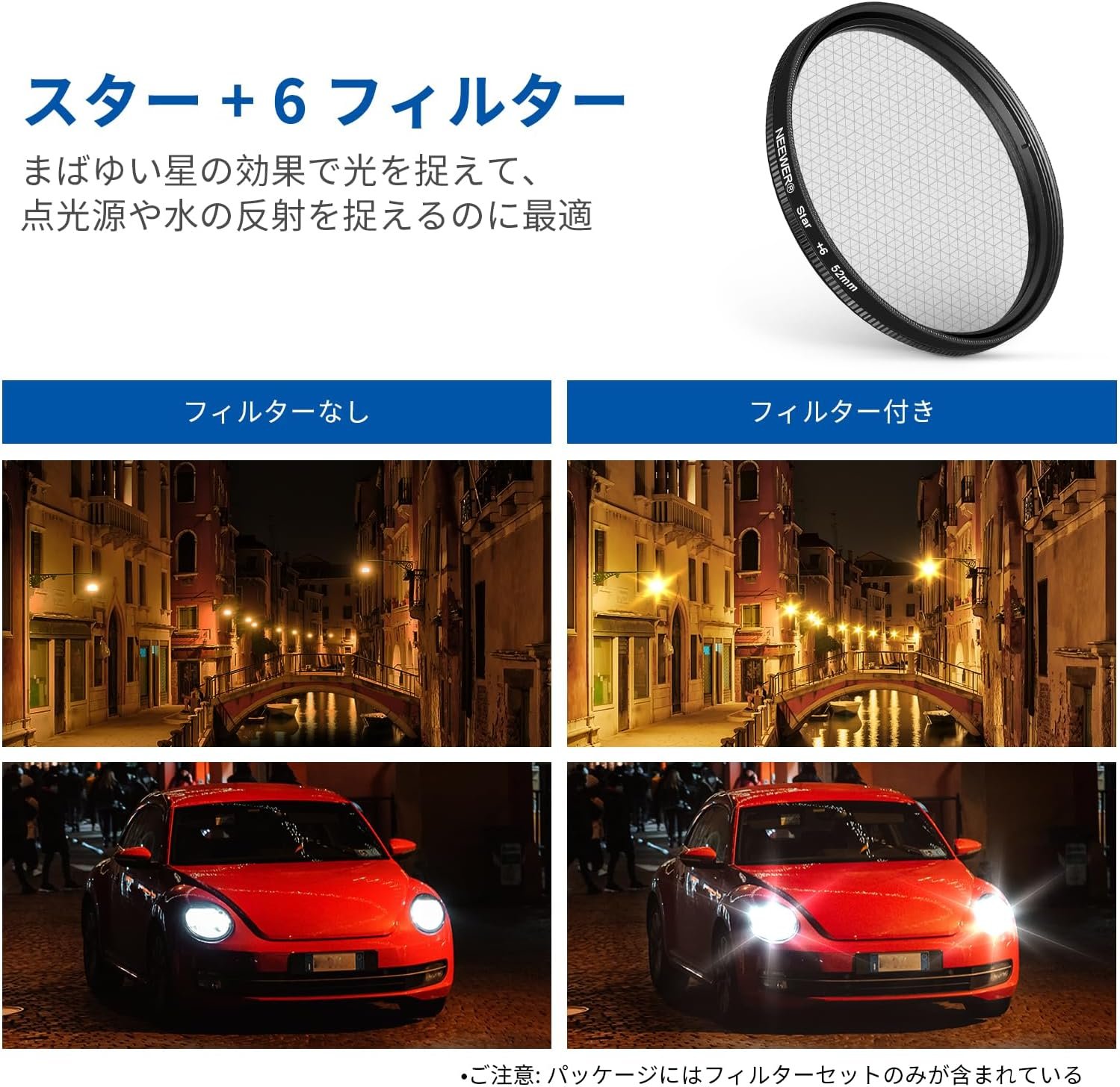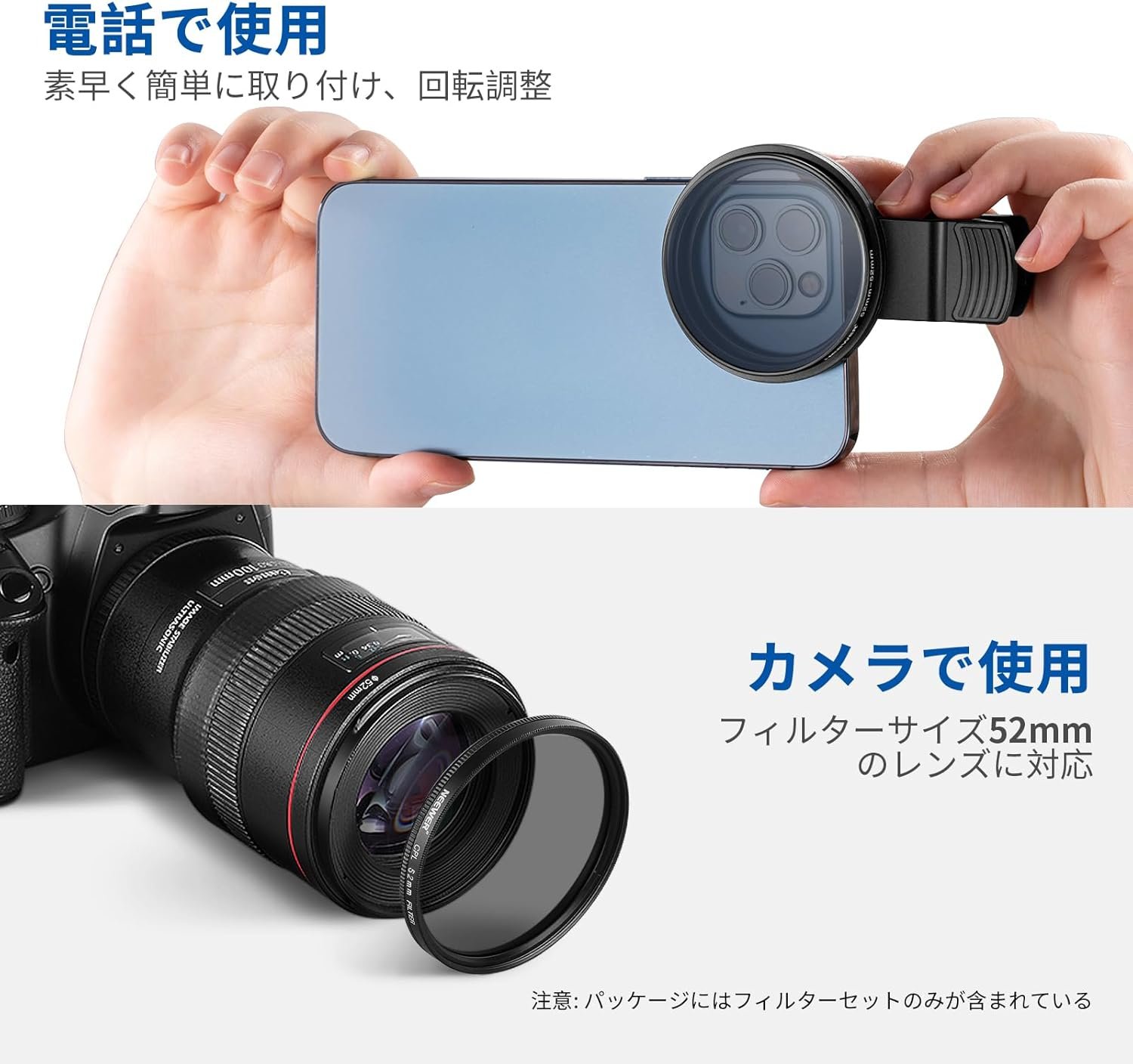 【レンズフィルターキット】このキットには、4つの52mm段階のカラーフィルター(赤、オレンジ、黄色、青)、1 52mm CPLフィルター、1 52mm ND32フィルター、1 52mm 6ポイント星フィルター、1レンズクリップが含まれています。アルミニウム合金フレームは、安全なインストールを保証し、取り付けて削除しやすくなります。注:光の漏れを防ぐには、携帯電話ケースを使用しない方が良い