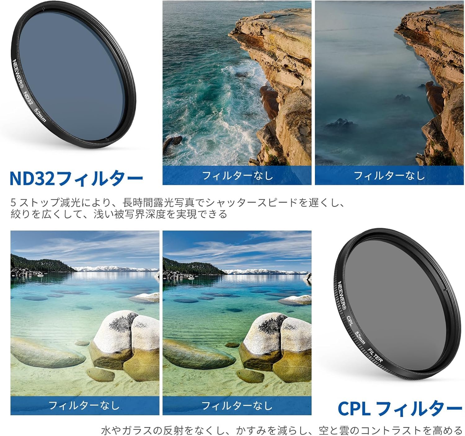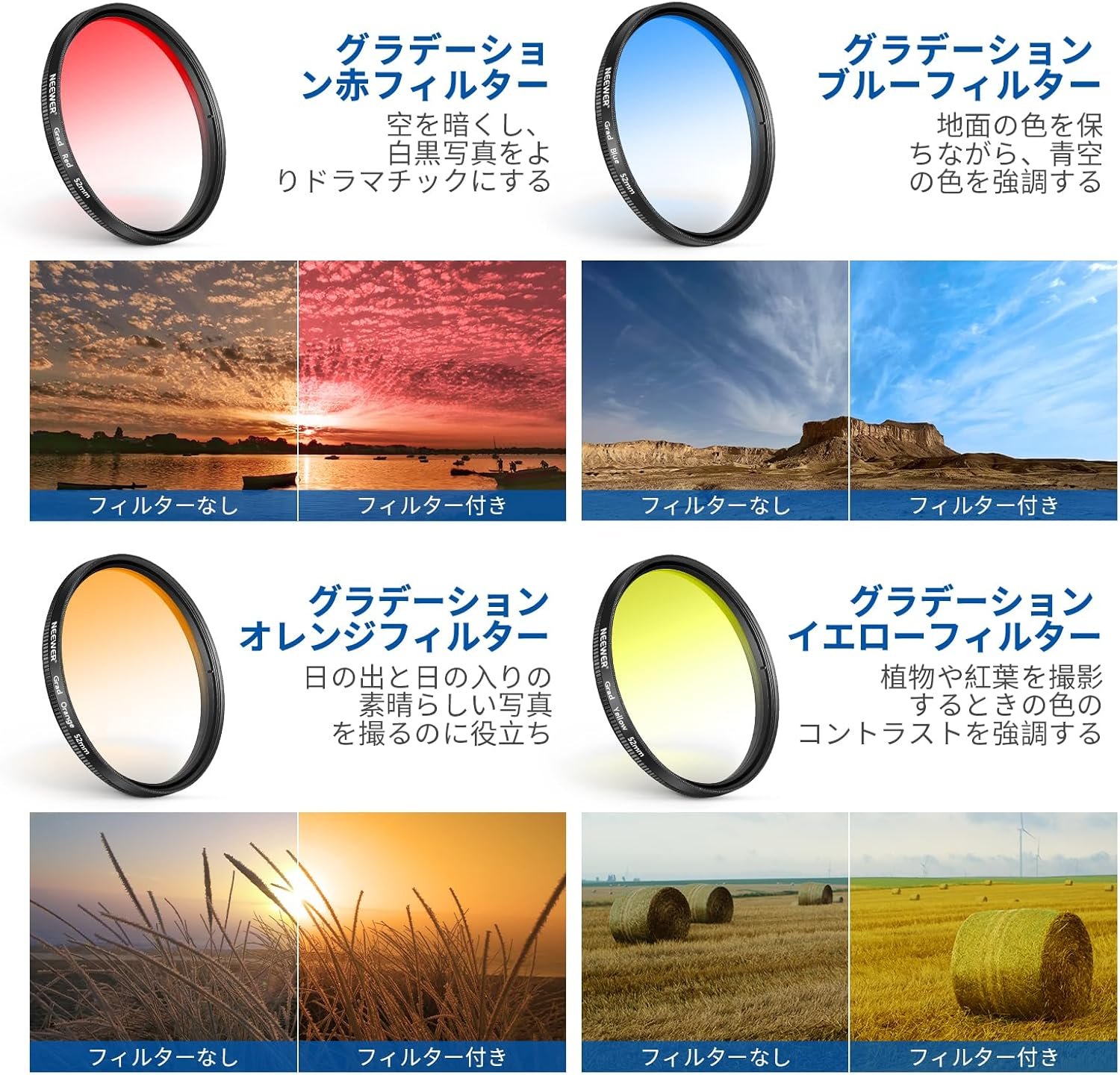 circular円偏光フィルター】円、ガラス、その他の表面から不要な反射を除去することができます。この効果は、青い空や白い雲のコントラストと飽和を高めるためによく使用されます