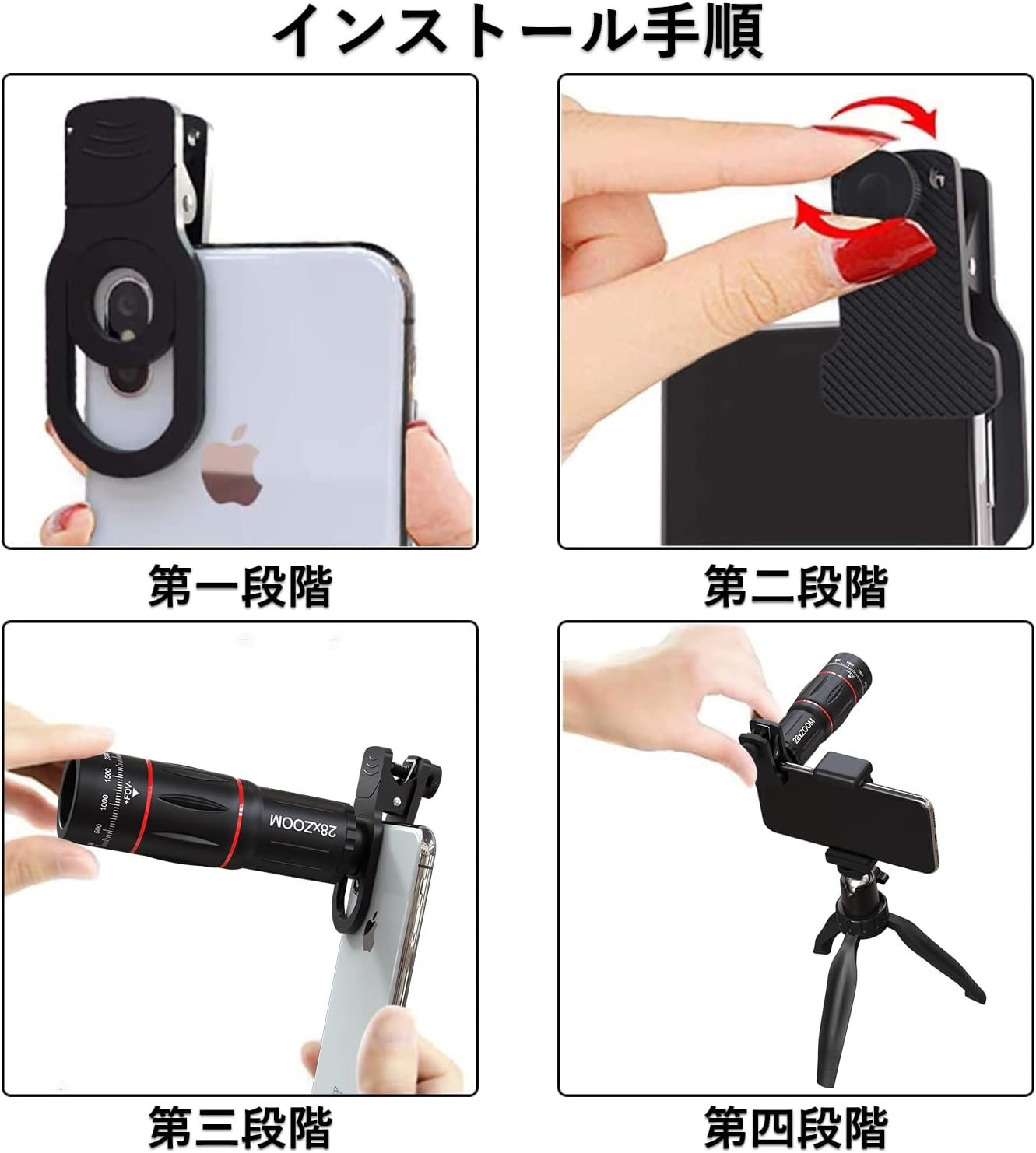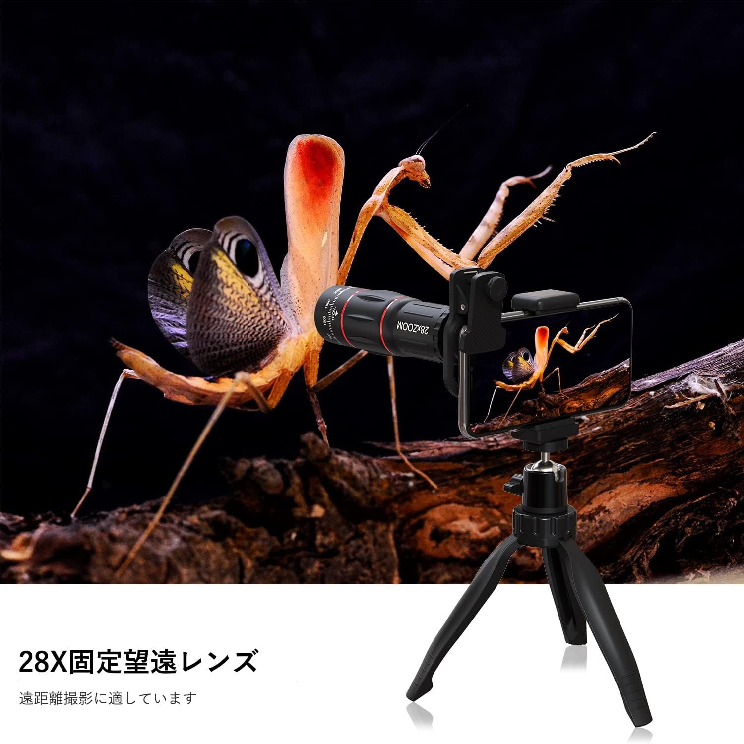 Smallyin 4 in 1スマートフォンカメラレンズ28x望遠レンズ、スマートフォンレンズ、電話カメラレンズ、トリプルレンズキット、0.6x広角、20xマイクロレンズ、198°フィッシュアイ、ミニ三脚、保管バッグが含まれています、