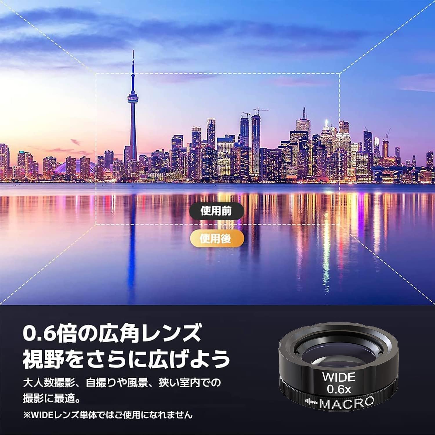 0.6x広角レンズ:幅0.6倍のレンズは、歪みなしで強化されます。 MRCコーティングテクノロジーは、ビグネットの歪みがないことに重点を置いて、通常の広角レンズよりも大きな開口部を持つレンズを採用し、vignettingと4つの角の歪みを完全に修正します。より広い範囲の風景、建築、セルフィー、集まった写真を撮影したいときに使用するのに適しています。セルフィースティックまたはスマートフォンの三脚を使用して、広角効果を作成します