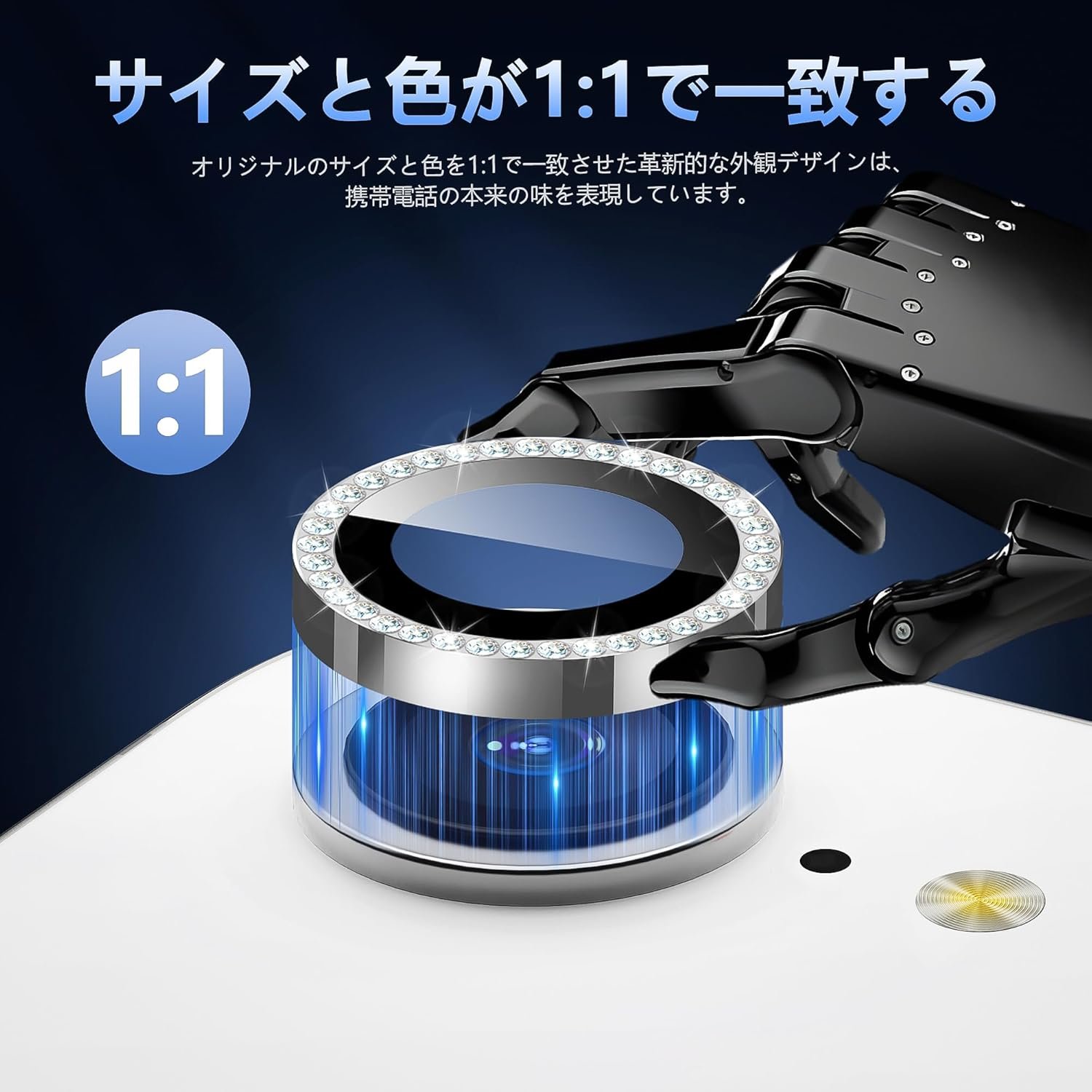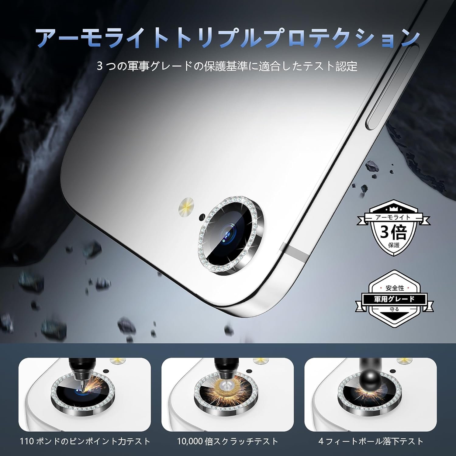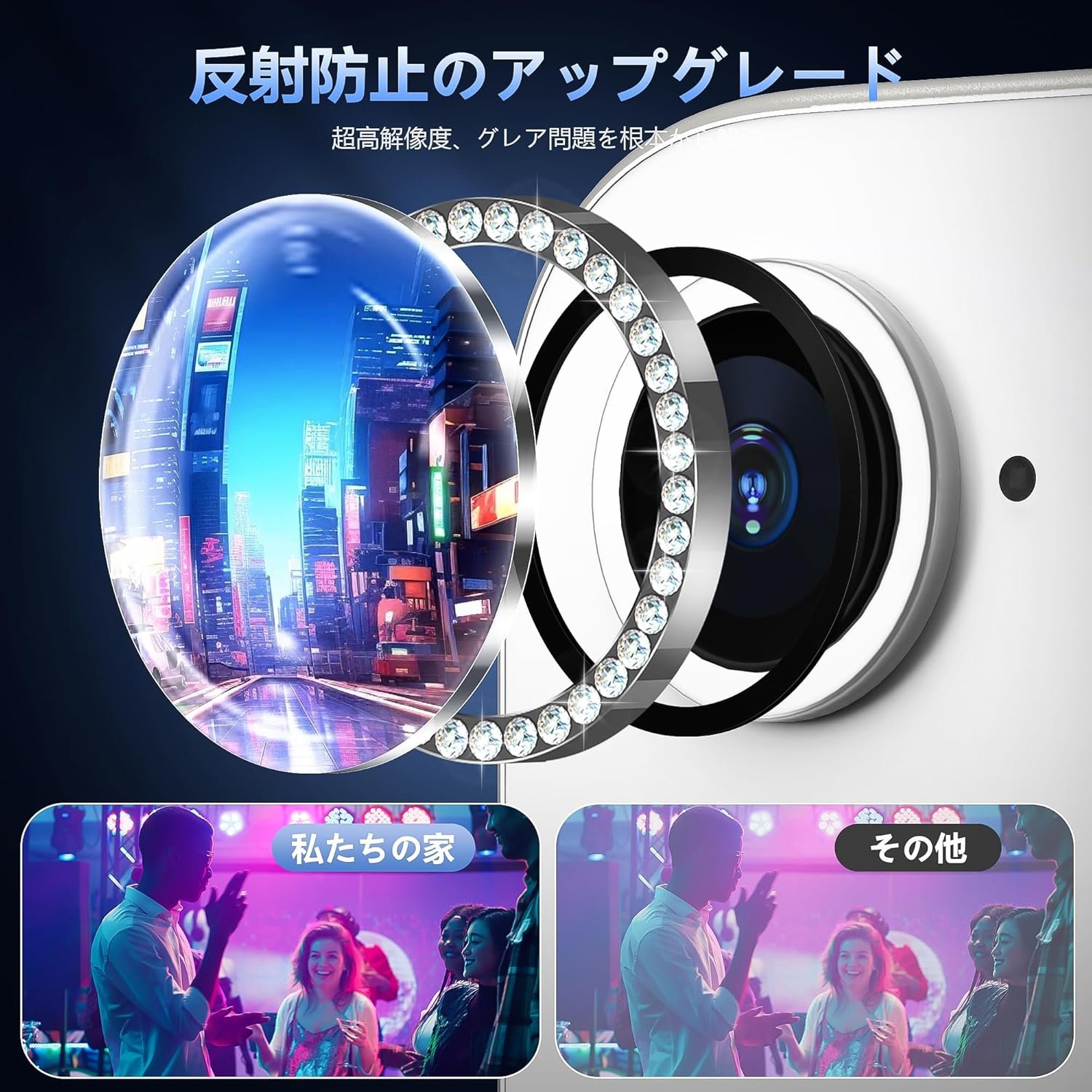 製品特徴 C カメラレンズ保護カバー ベゼルには光を反射するダイヤモンドが光の環境下でキラキラと輝きます。レンズ部分には9H強化ガラス膜を使用し、エッジのブラックコーティングによりレンズへの大量光や派手な光の侵入を防ぎ、露出を軽減します。