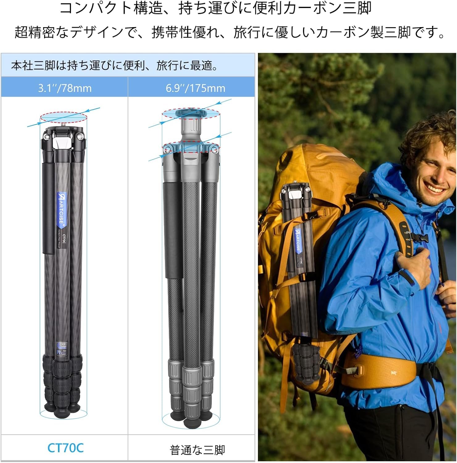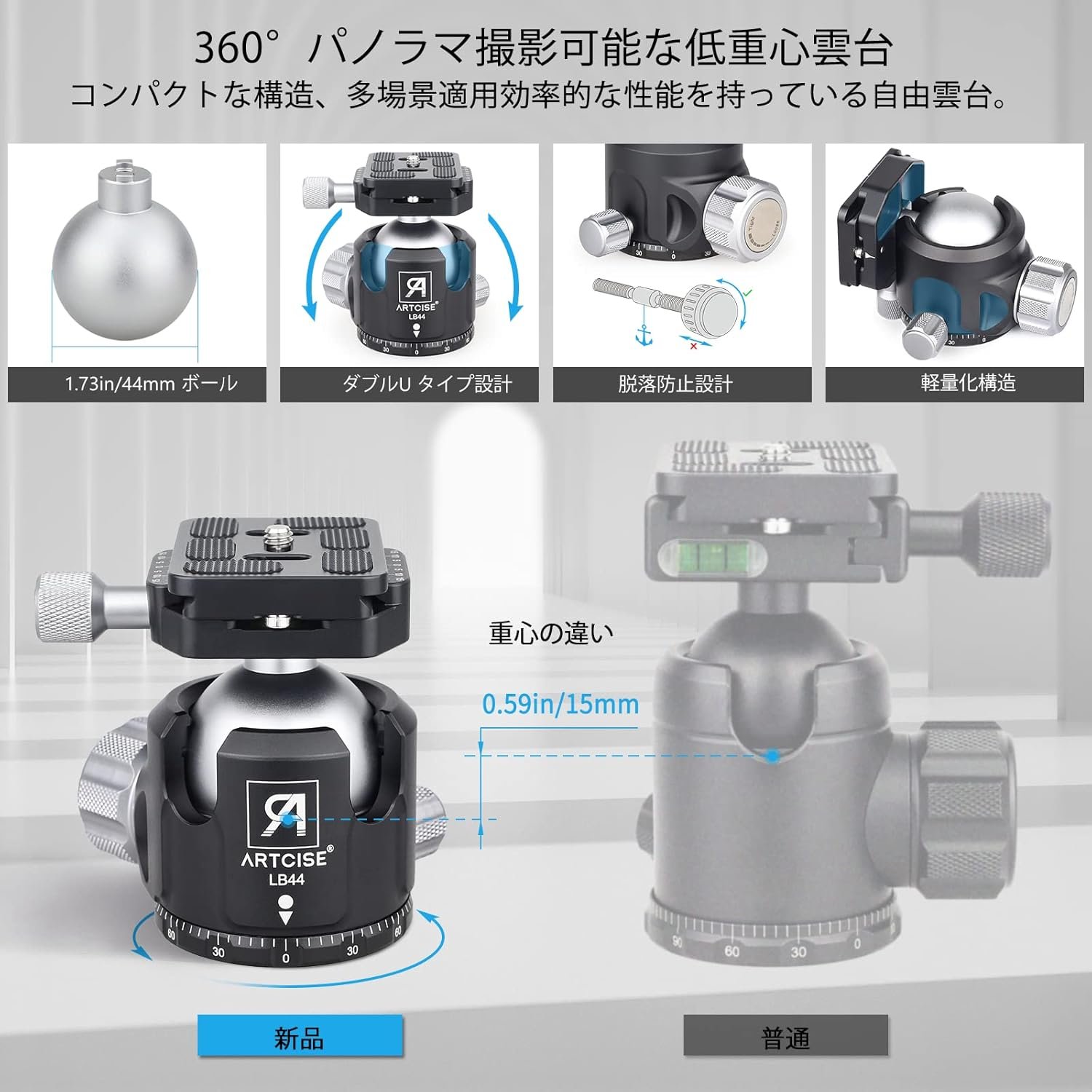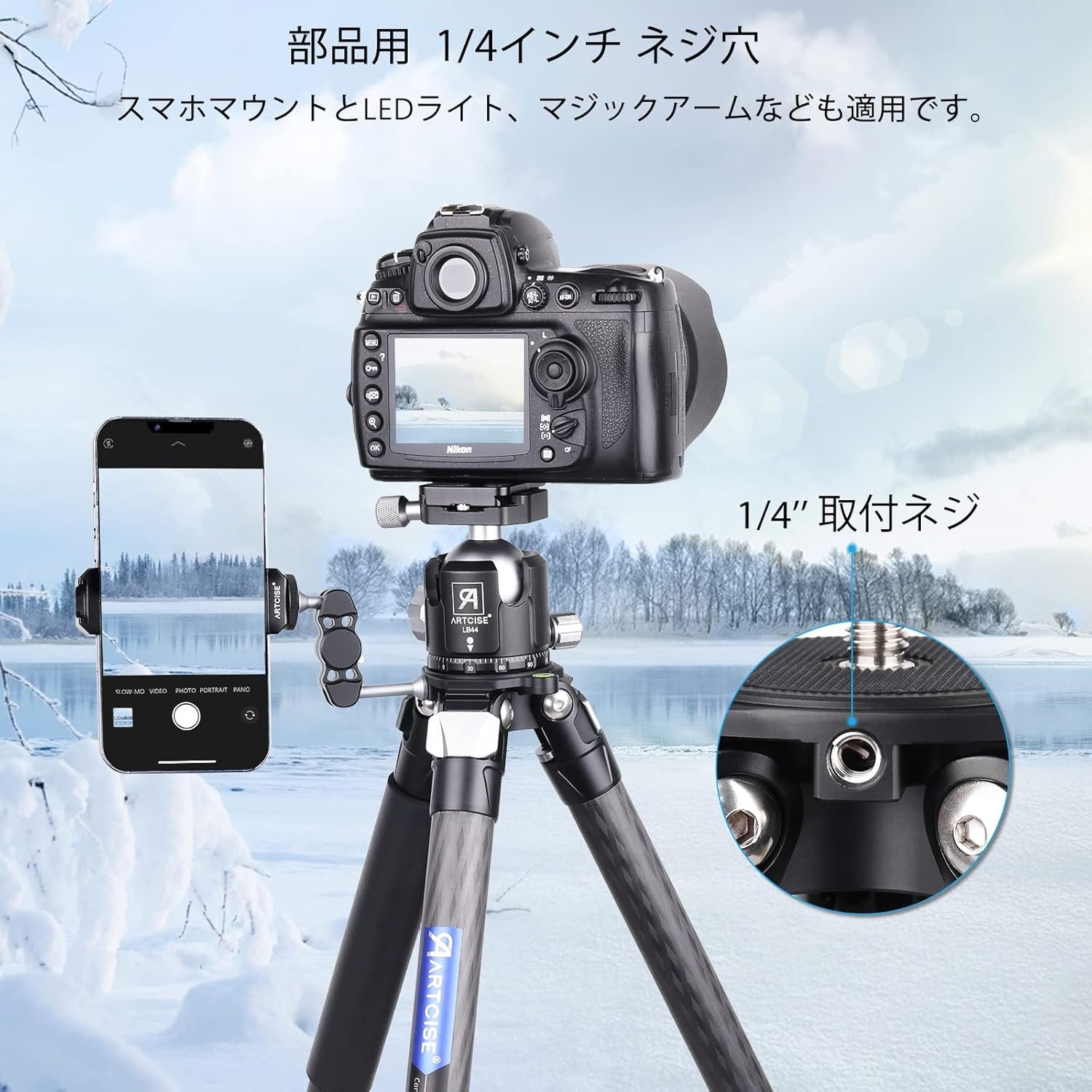 ArtCise炭素三脚、低重心、1.7インチ(44 mm)のボールヘッド、パイプ直径1.1インチ(29 mm)、総高さ:65.3インチ(1660 mm)、フルビューの回転、軽量設計、4