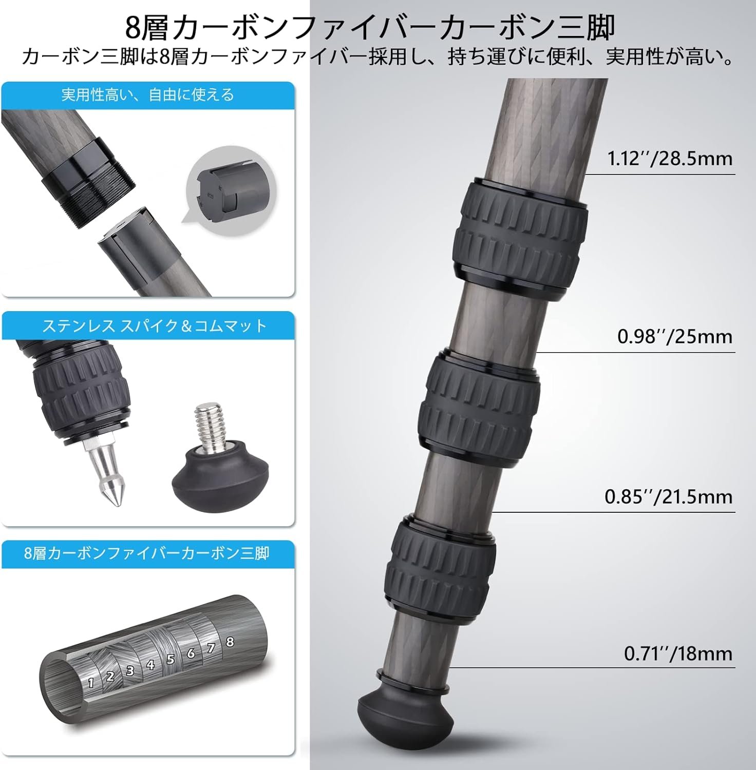 8層カーボンファイバー高精度ウルトラ安定カメラ三脚:8層カーボンファイバー構造により、豪華な外観と感触が得られ、安定して信頼性があります。炭素繊維三脚の脚には4段階のナットロックデザインがあり、安定性の意味でかなりの利点があるため、複雑な環境で素晴らしい写真を撮ることができます。さらに、脚には天然の櫛が装備されており、ステンレス鋼のスパイクには安定性が向上するだけでなく、撮影時に振動を減らします。不安定な岩や不均一な地面などの滑りやすい環境での安定した射撃