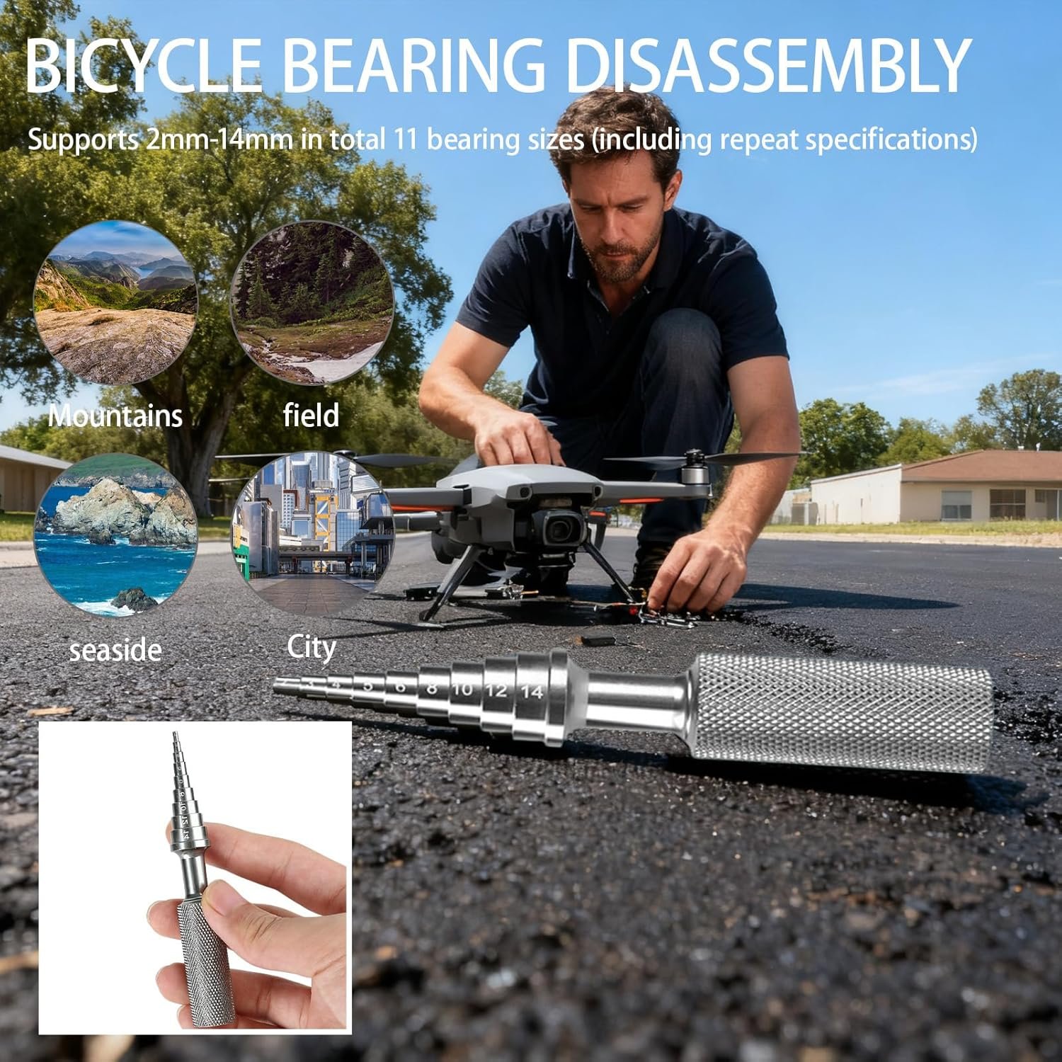 ドローンベアリングプーラーツールセット、RCカーベアリング除去ツール、アルミニウム合金、修理、分解、0.08-0.65インチ(2-14 mm)、内部、ベアリングプーラー、除去、ツールと互換性があります。