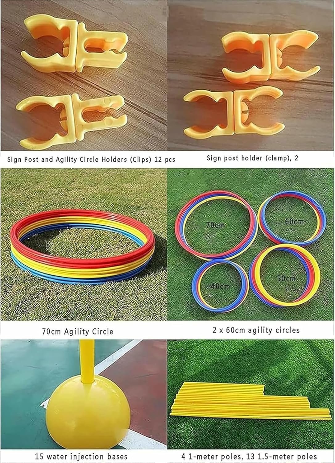パッケージには:1.5mロゴポール*13、1Mポール*4、水噴射ベース*15、60cmアジャイルサークル*2、70cmアジャイルサークル*4、サインロッドフィクサー(バー)*2個、サインロッドとアジャイルリングフィクサー(クリップリング)*12