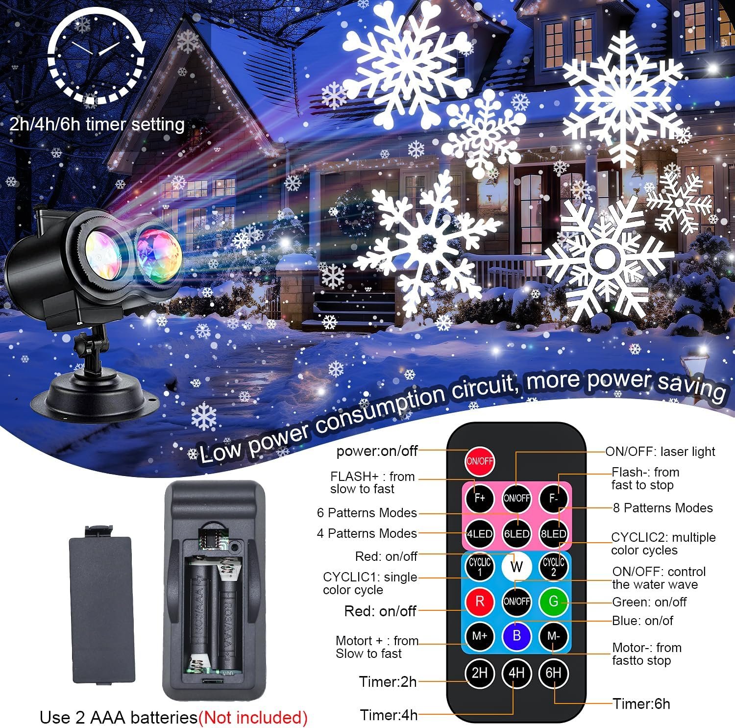 リモコンとタイマー:このクリスマスプロジェクターライトには、水の波の効果、移動速度、フラッシュ速度、オン/オフなどを選択できるリモコンが付属しており、お好みの色に合わせることができます。内蔵タイマーにより、2H、4H、6Hタイマーを設定して自動的にオン/オフにすることができます