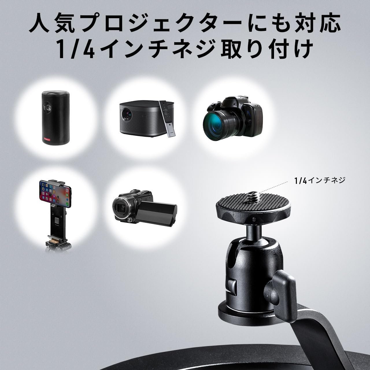 1/4インチネジと互換性があり、プロジェクターやカメラ、または互換性のある電話ホルダーを取り付けることができます。