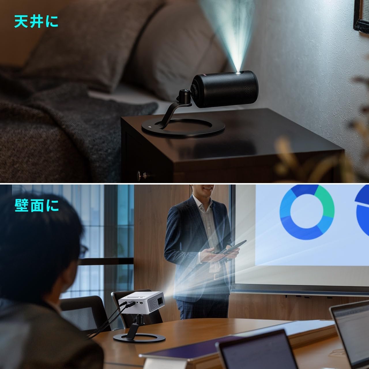 大きなスタンドを必要とせず、デバイスを机の上に置くことができ、スペースを節約できます。家庭やオフィスのプロジェクター環境におすすめです。