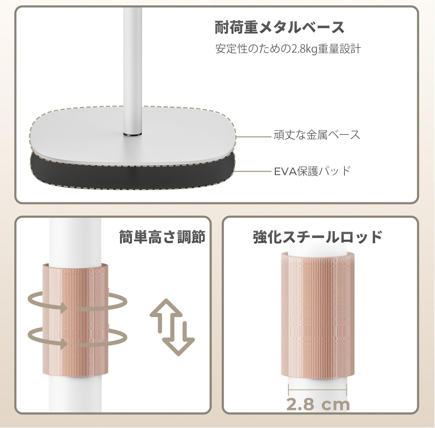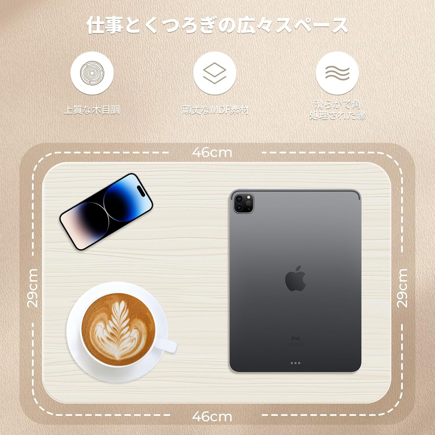 【プレミアム構造】 丈夫な金属サポートロッドと幅広のベースにより、比類のない安定性を実現し、長時間の使用でもデバイスをしっかりと固定します。美しく仕上げられた木製パネルが耐久性のある金属フレームを引き立てます。天然木目と滑らかで快適な表面を持つMDF製