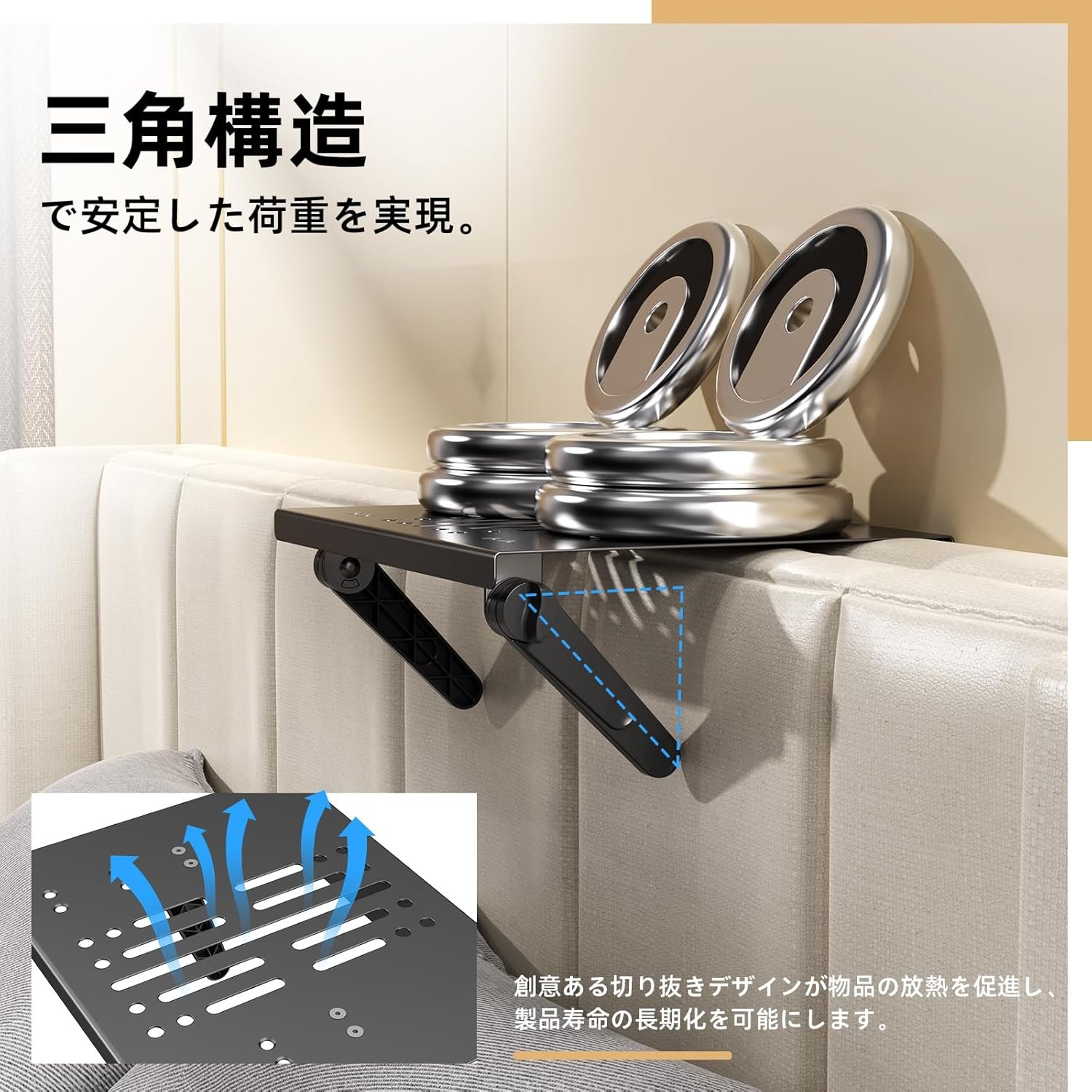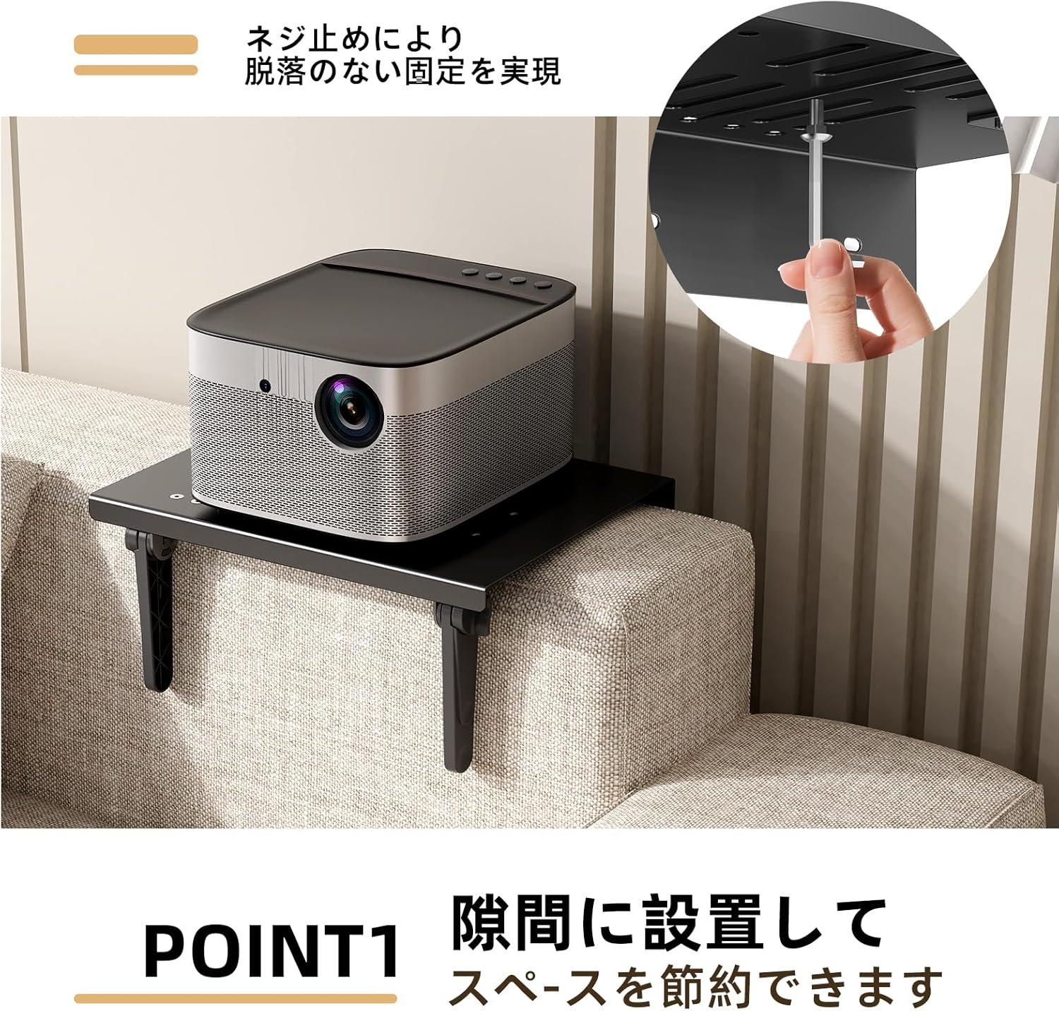 三角構造とメッシュデザインで安定性と放熱性を両立:高強度の金属素材を採用。安定した三角構造と合わせて驚異の耐荷重20kgを実現。さらに、底部のメッシュデザインにより、プロジェクターの熱を効率的に放散できます。長時間の連続使用でも安心 過熱や機器の故障による脱落リスクを防止