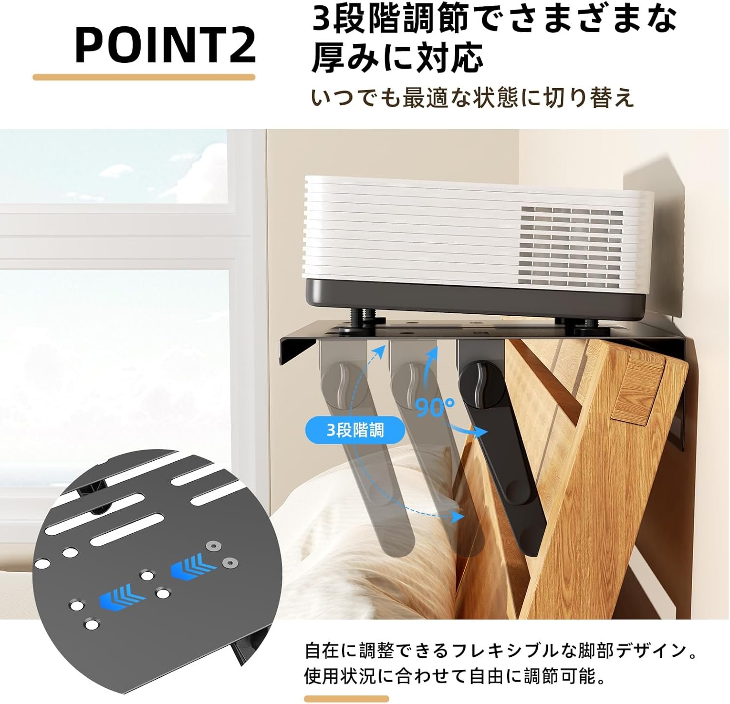 【プロジェクターにぴったりフィットする3段階の調整 – 最適な視聴を実現する90°の角度調整】プロジェクターの厚さに応じて3段階の高さ調整と、最大90°までの細かい角度調整が可能です。薄型プロジェクターから大型プロジェクターまでしっかりと固定し、床や天井に自由に投影できます。交差点のレイアウトや椅子の高さに合わせて最適な視認性を実現する「ゴールデン ポジション」に簡単に調整できます。