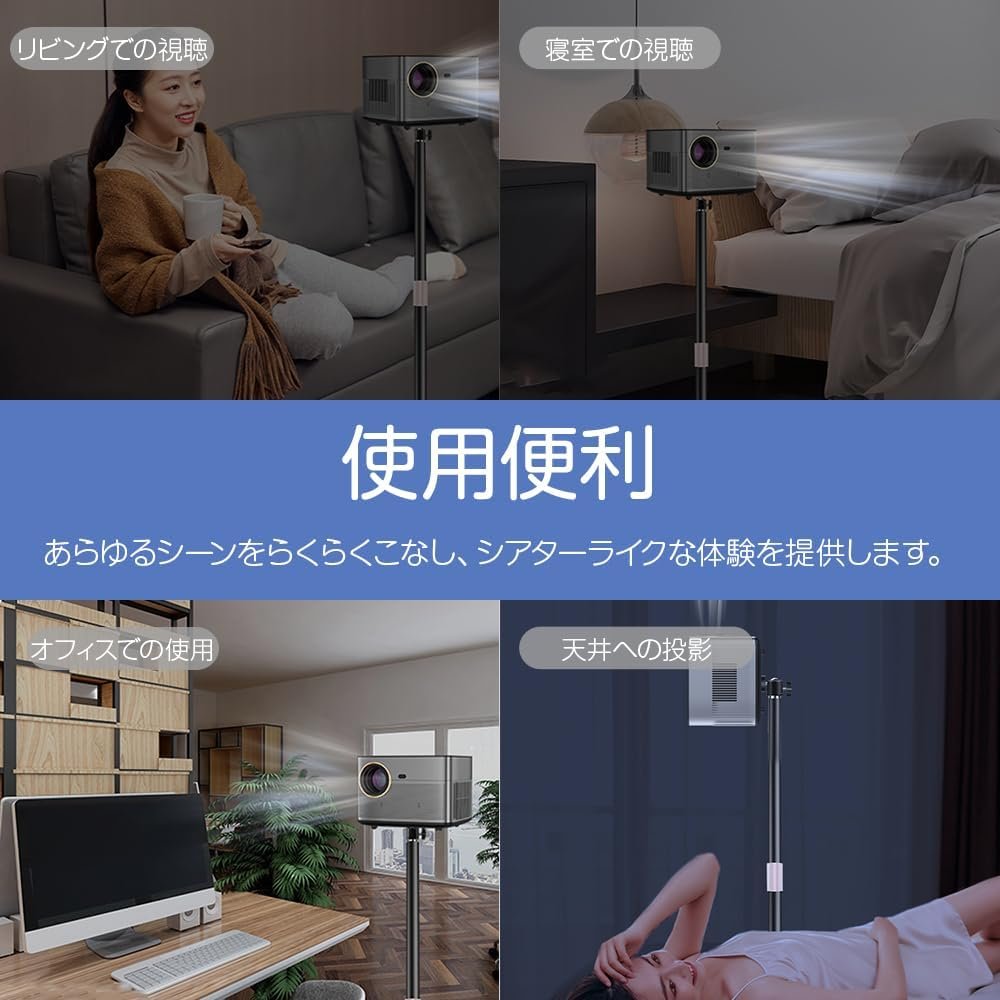 【幅広い用途】プロジェクタースタンドは、ベッドサイド、ソファ、リビングルーム、オフィス、会議室など、さまざまな場所に自由に設置でき、快適な視聴体験を得るために最適な投影角度を見つけることができます。マイクロプロジェクター、カメラ、ビデオカメラにも対応