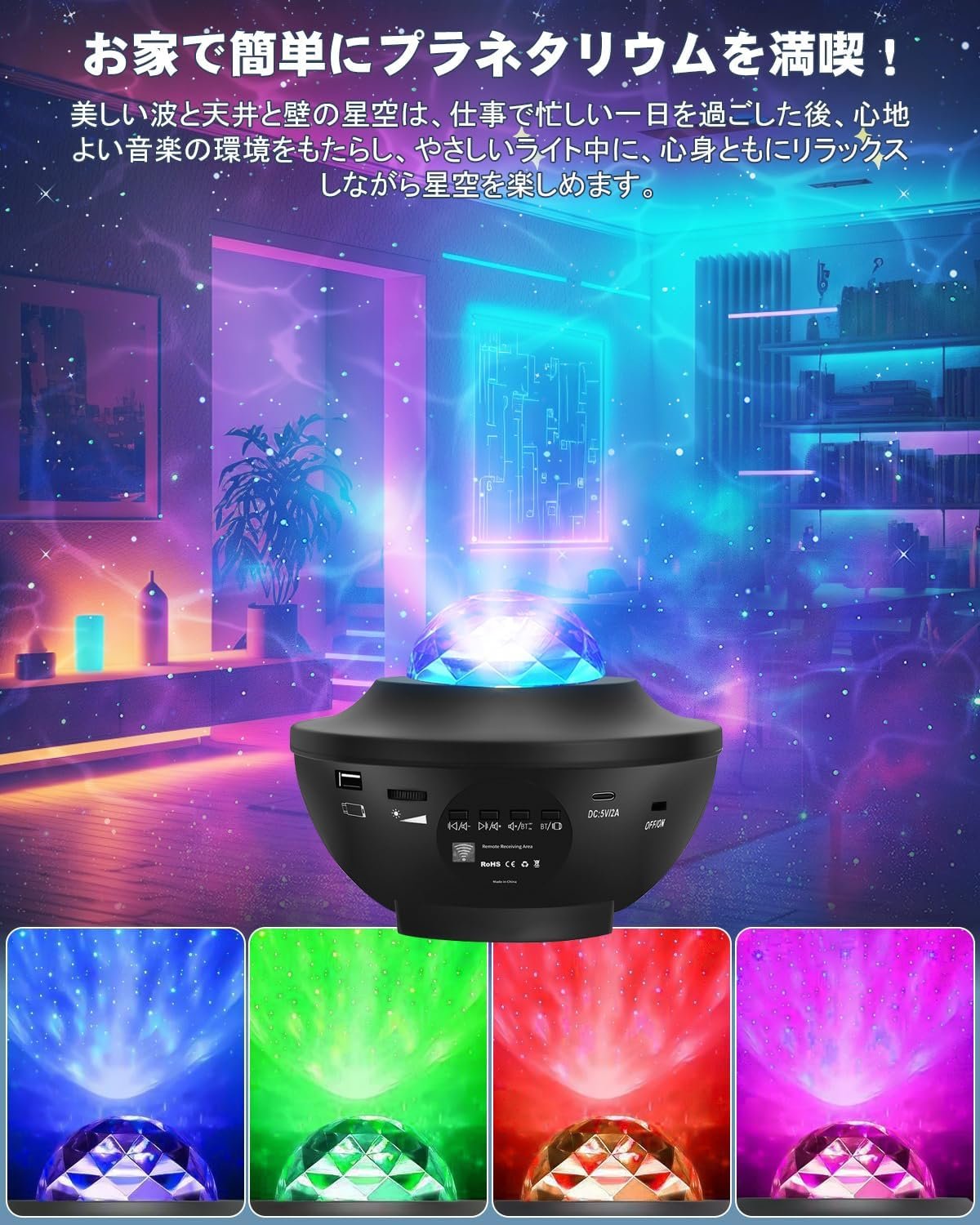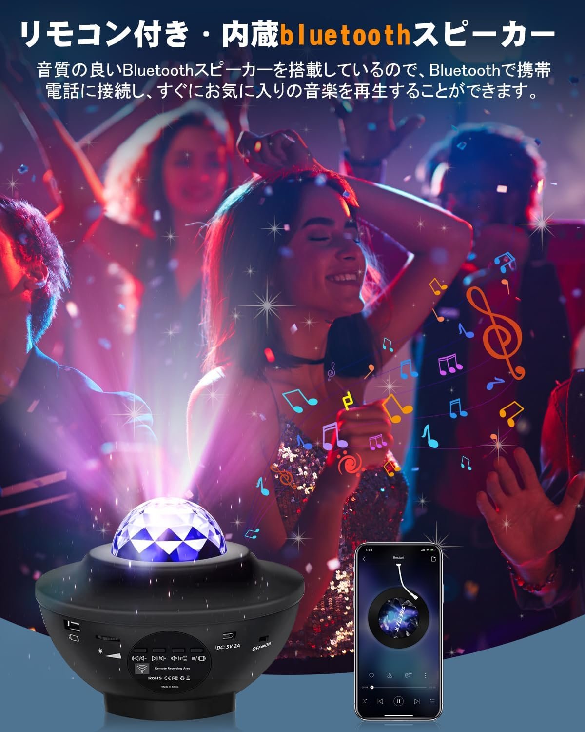 (2025人気バージョン)スタープロジェクターライト、ベッドサイドランプ、リモートコントロール、屋内インテリアライト、10の照明モード、Bluetooth&USBメモリ、音楽再生、音楽モード、海面、プロジェクションライト、
