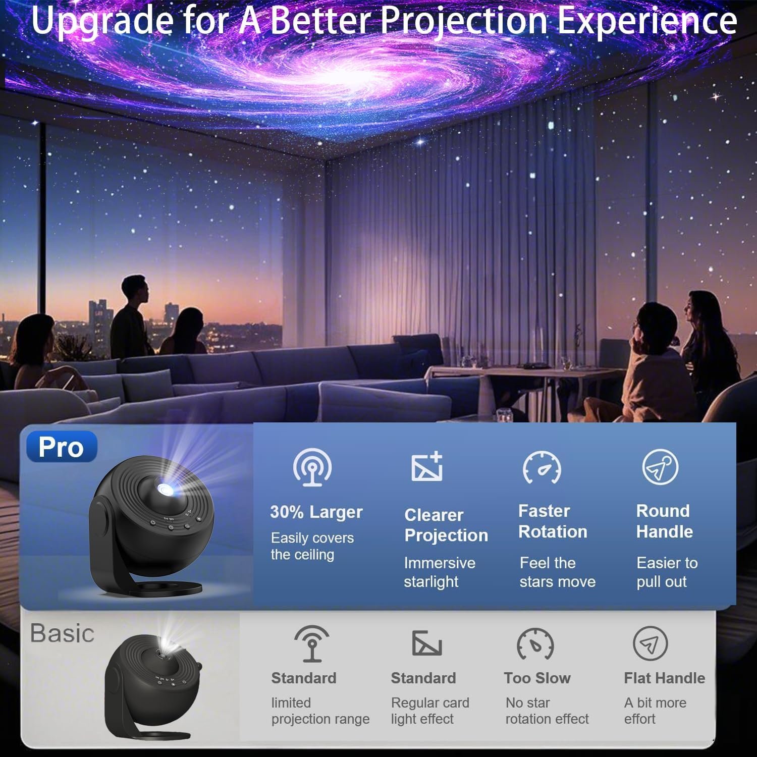 brightグライドワイドHDプロジェクションと調整可能なフォーカスをアップグレードしました – 輝度を2倍、以前のモデルよりも30%大きくします。トップフォーカスヘッドを回転させることにより、投影距離に関係なく画像の明確さを調整できます。 6.6フィートから10フィートの投影距離と135.19平方フィートから255.64平方フィートまでの面積をサポートします。 360°回転可能な角度で、太陽系プロジェクターは天井、壁、または床に投影できます