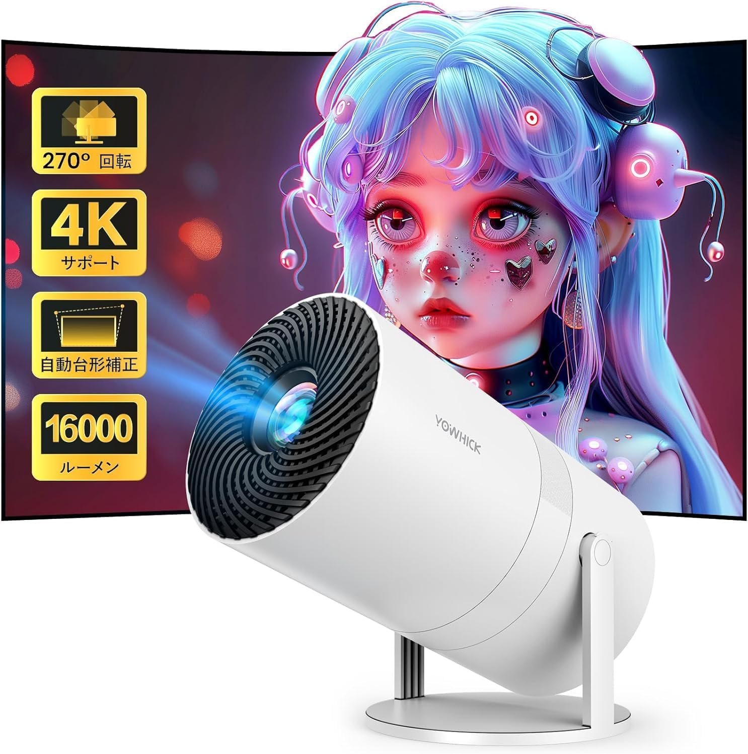 Yowhickプロジェクター、210°回転、Android TVが含まれ、小さい、13,000 lm、1080p、Wi-Fi6、4K互換性、天井投影、自動キーストーン補正、Bluetooth 5.3、ビルトインHifiスピーカー、ホーム