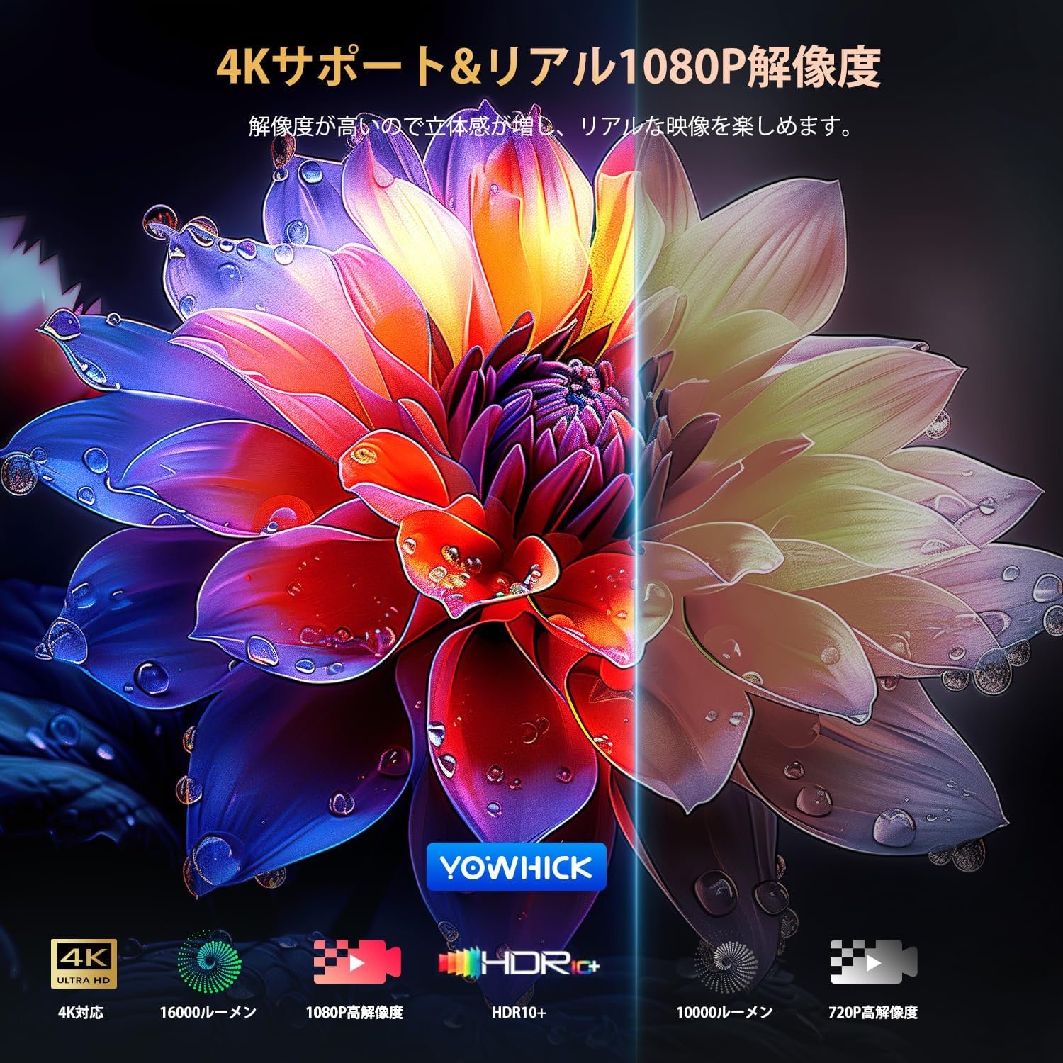 (13,000ルーメンの高輝度、1080pの高解像度、4Kサポート)ホームプロジェクターは輝度が13,000ルーメンに改善され、ネイティブ解像度は1080pにアップグレードされ、NTSCカラーのガットの95%以上をカバーし、高色の繁殖で、予測された画像は鮮やかで鮮やかで、元の色に近い。プロジェクターは、画面のない白い壁に直接投影して、自然な形で詳細な色を作成して美しい画像を楽しむことができます。優れた10,000:1のコントラスト比を最大化することは、4Kソースを使用して美しい再生を使用することもできます。ホームシアターやスポーツゲームに最適です。自宅で高解像度のビデオを楽しむことができます
