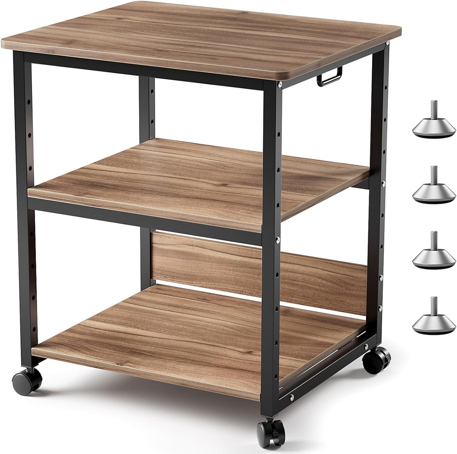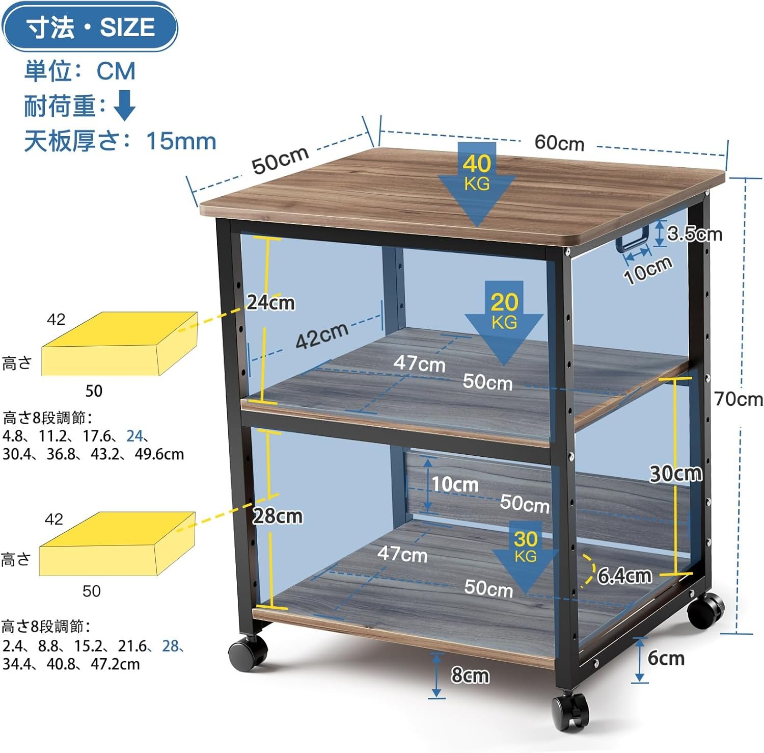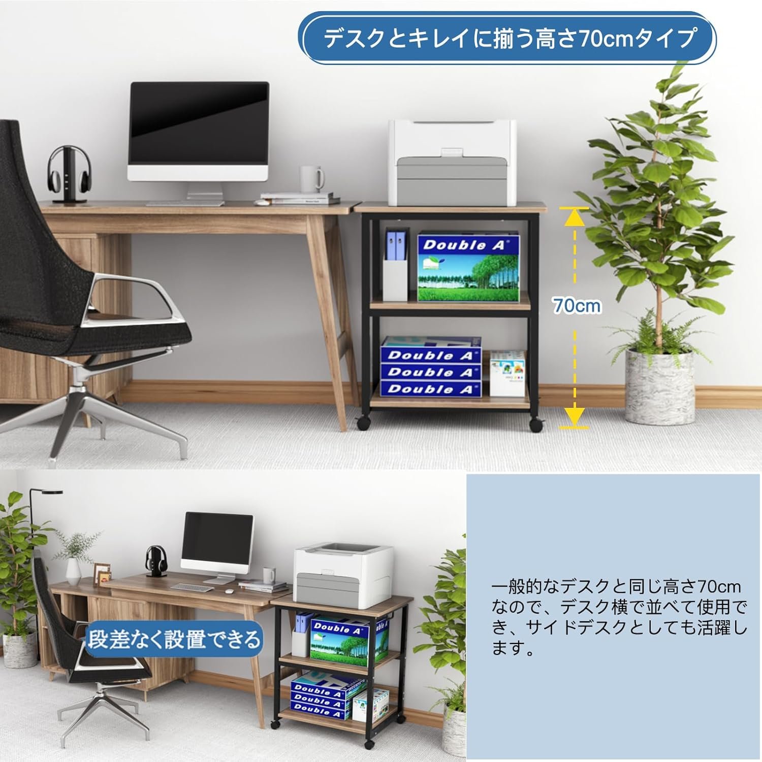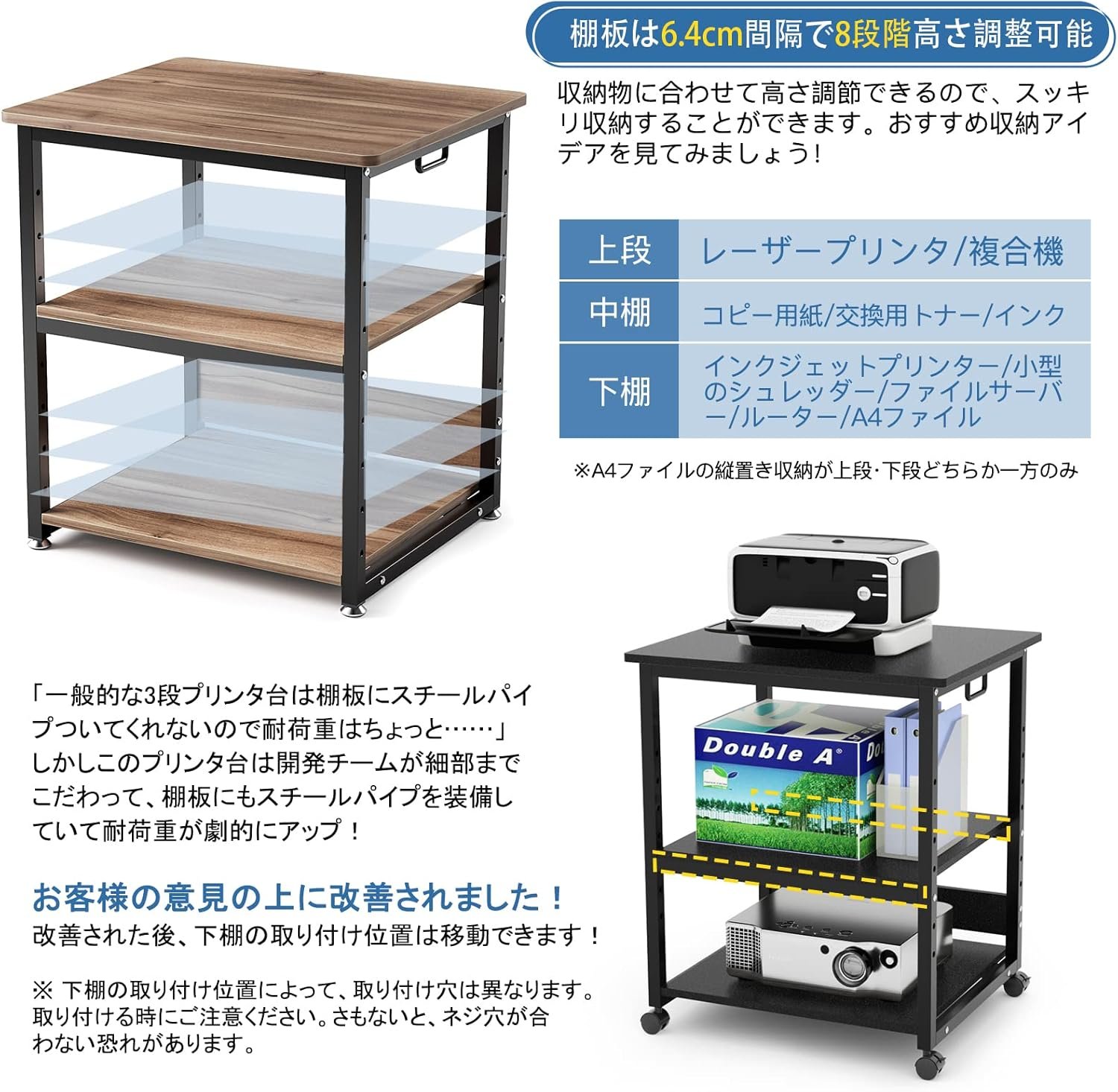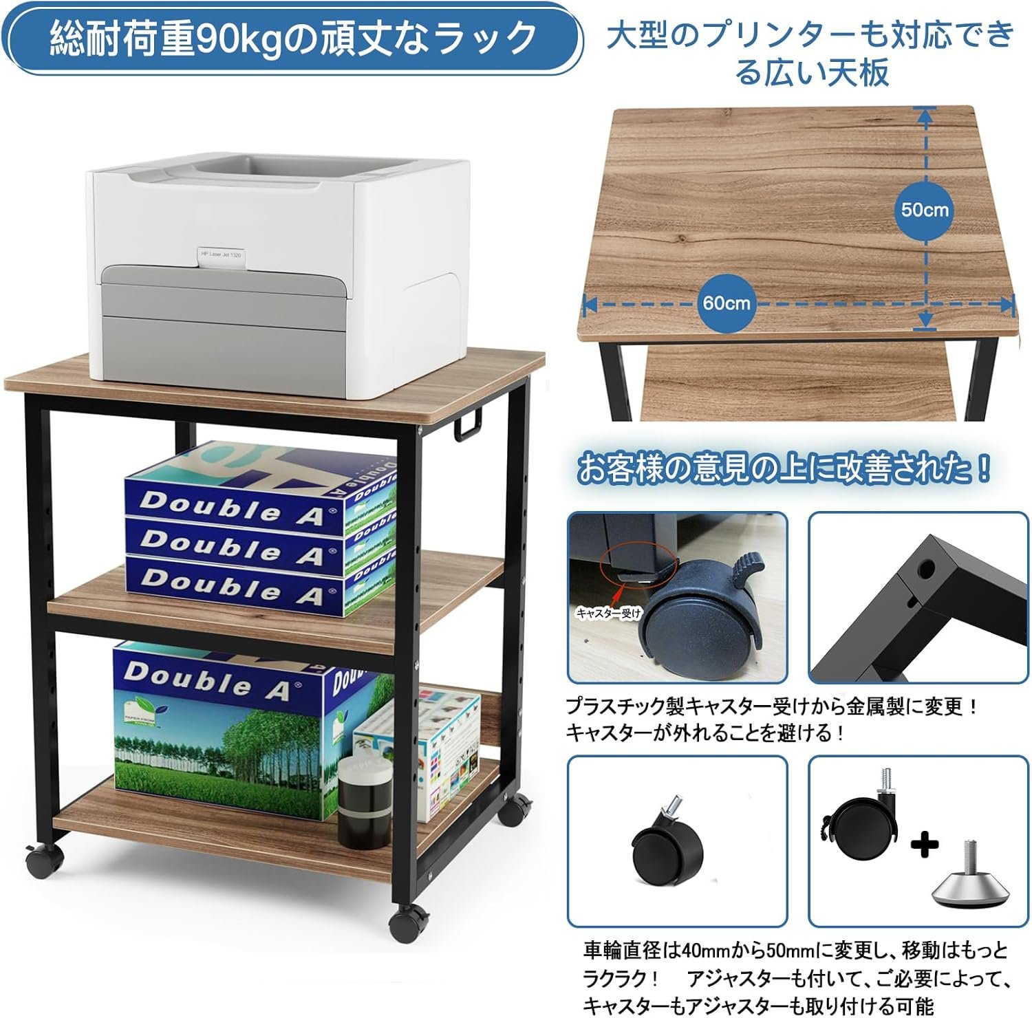 198.4ポンド(90 kg)の総負荷容量をサポートします。 23.6 x 19.7インチ(60 x 50 cm)の広いトッププレート。これは、頑丈なスチールフレームを備えた頑丈な3層プリンタースタンドです。総負荷容量は198.4ポンド(90 kg)です。インクジェットコンポジットマシンやオフィス用品などの重いアイテムを保持するために使用できます。 ★大きなレーザープリンターのためにオフィスで使用できる幅の広いトッププレートを装備しています。たくさんのストレージで、レーザープリンターを上層と中間層に置いて、コピー用紙、交換用トナーとインク、インクジェットプリンター、または下層にA4ファイルなどの消耗品を保存できます。