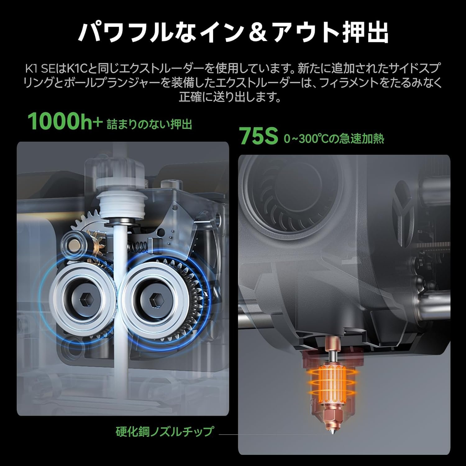 Reliable Flagship Extruder: Creality K1 SE uses the same extruder as K1C. The extruder with newly added side springs and ball plunger delivers precise filament without sagging. In addition to regular filaments, it can also handle flexible TPU