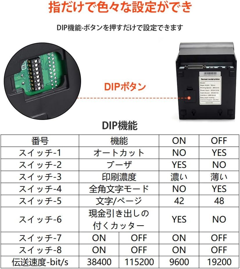 マルチターミナル互換:サーマルレシートプリンターには、さまざまなデバイスに適合するために、USB、シリアル、Thernet/LANの3種類の接続があります。 Windows、Mac、Linux、Androidなどを含む幅広いデバイスと互換性があります。ただし、Square POS、Sumup Square、およびIOSソフトウェアはサポートされていません。 BluetoothまたはWi-Fi関数はありません