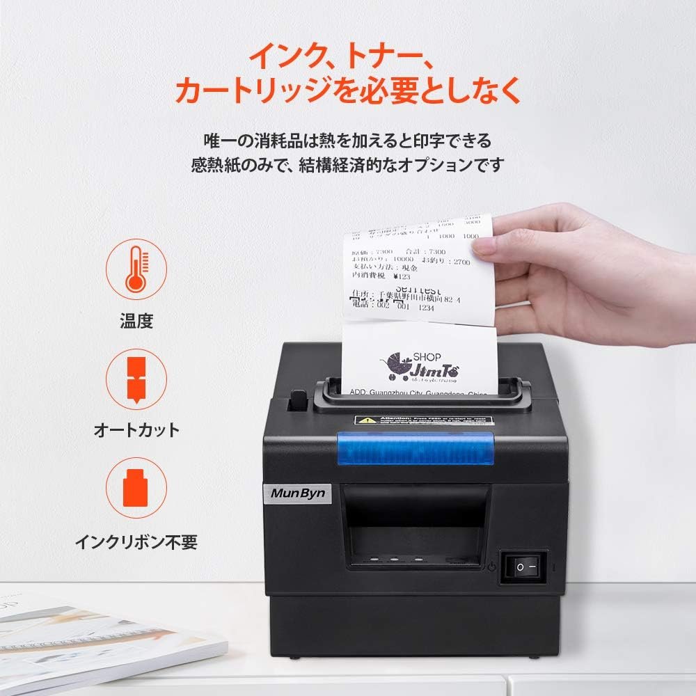Munbynプリンター、領収書プリンター、サーマルプリンター、ESC/POS、EPSONコマンド互換、領収書/請求書、11.8インチ(300 mm)/S高速印刷、USB/シリアル/LANポート、マルチターミナル接続、
