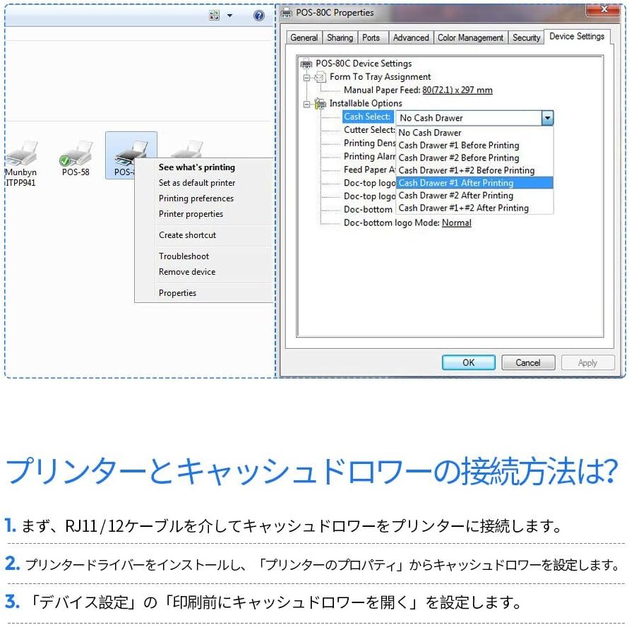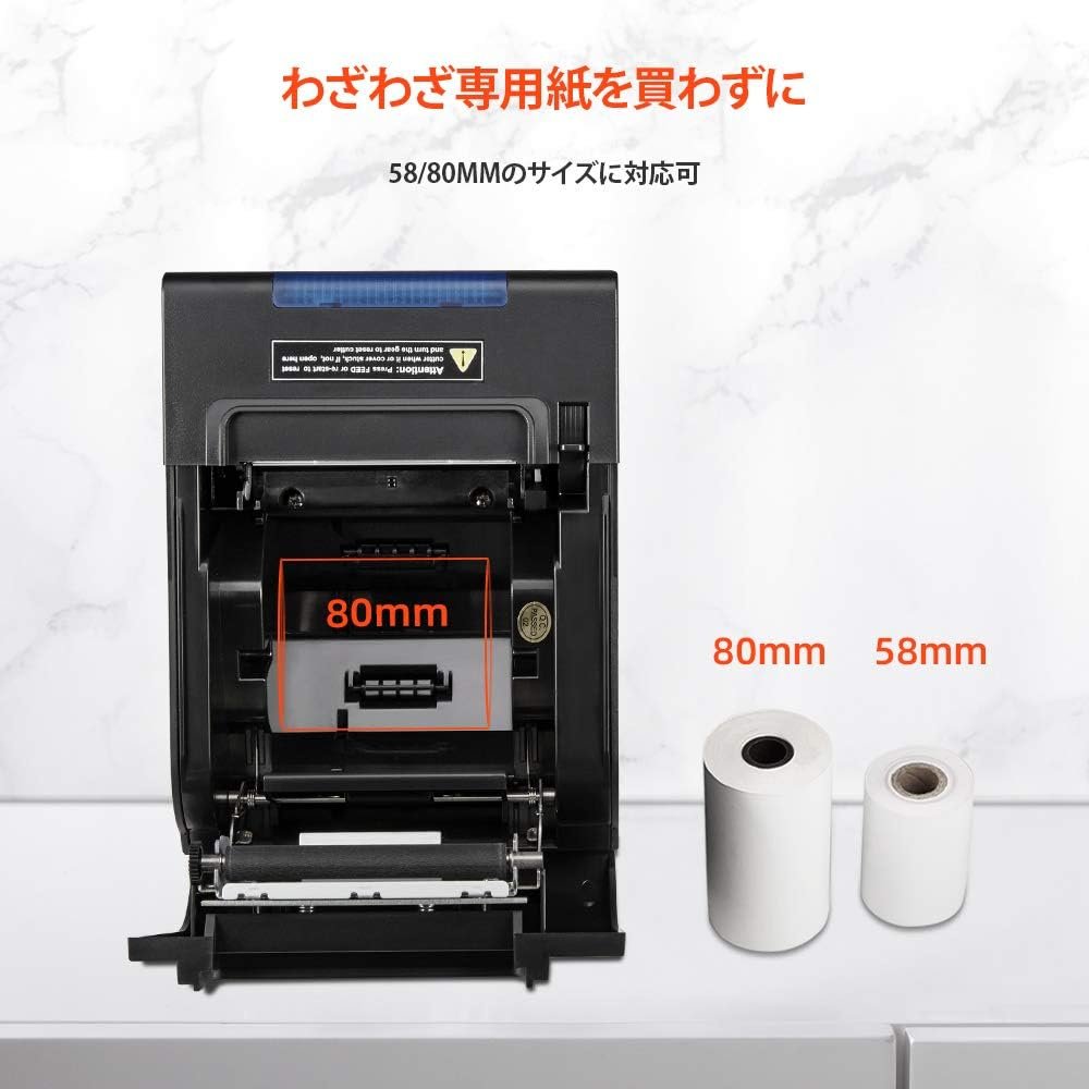 紙のサイズ:紙の幅:2.3 / 3.1インチ(58 /80 mm)、最大ロール直径:3.3インチ(83 mm)