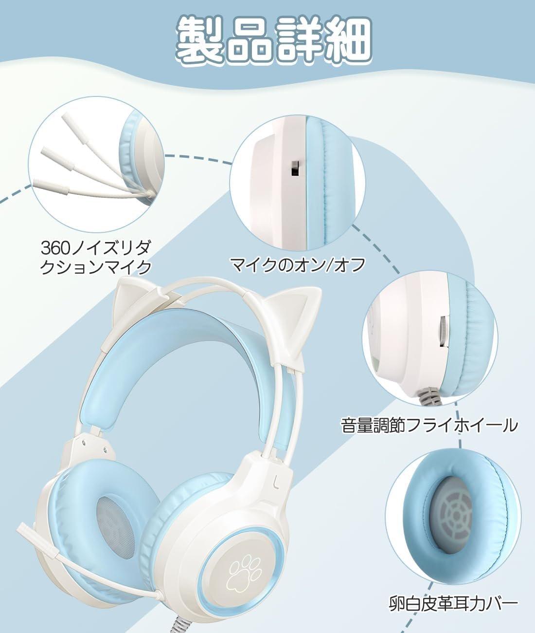 かわいいヘッドフォン、ゲームヘッドフォン、猫の耳ヘッドフォン、ゲームヘッドセット、女の子、LEDライト、色の変化、0.1インチ(3.5 mm)有線、6.6フィート(2 m)ケーブル、望遠鏡ヘッドフォン、耳ヘッドフォン、360°