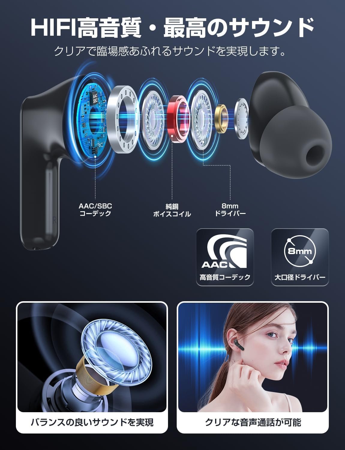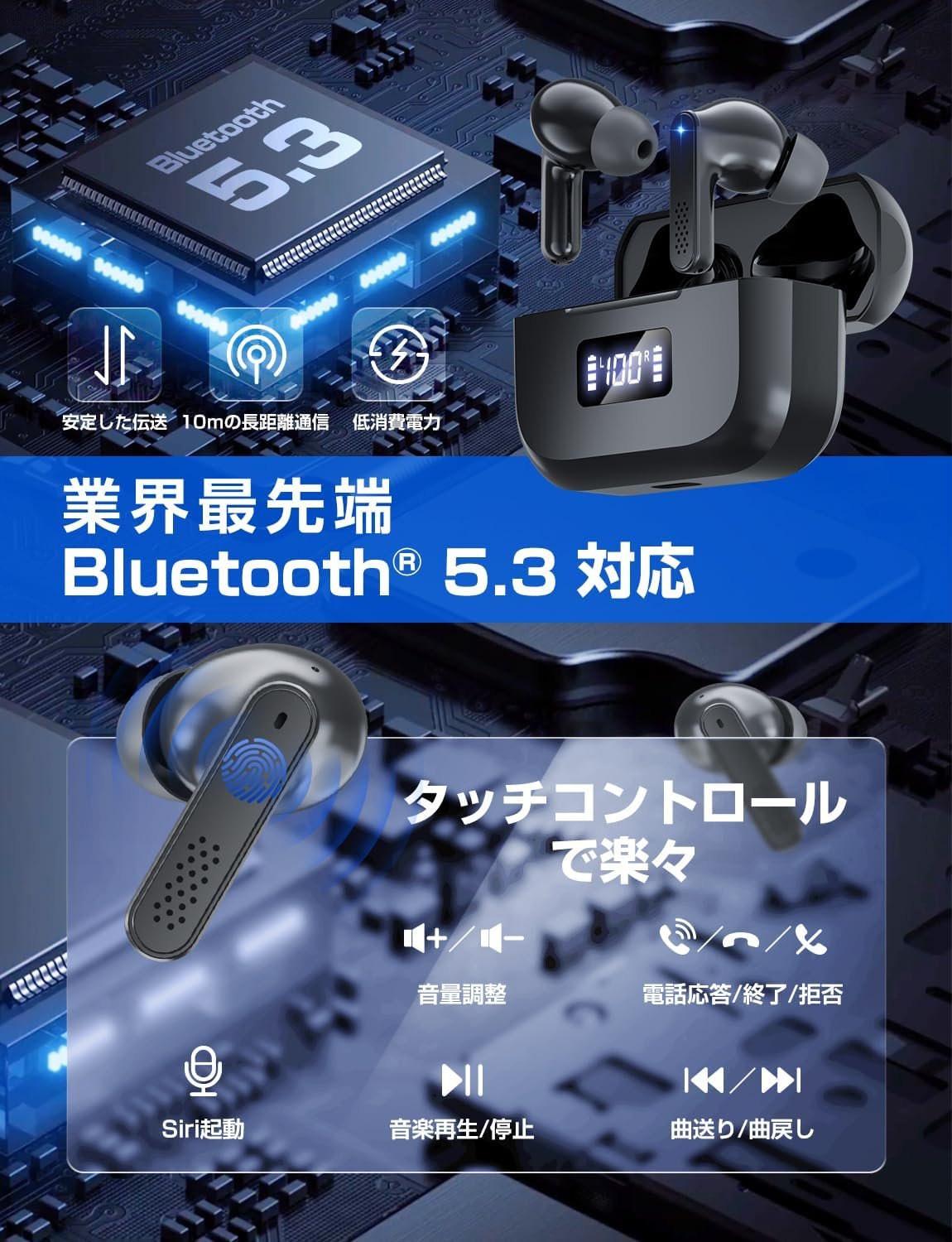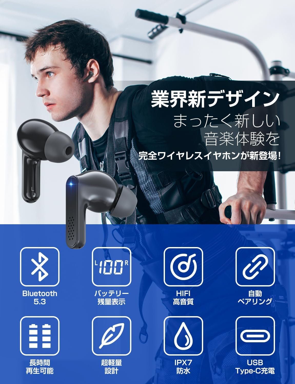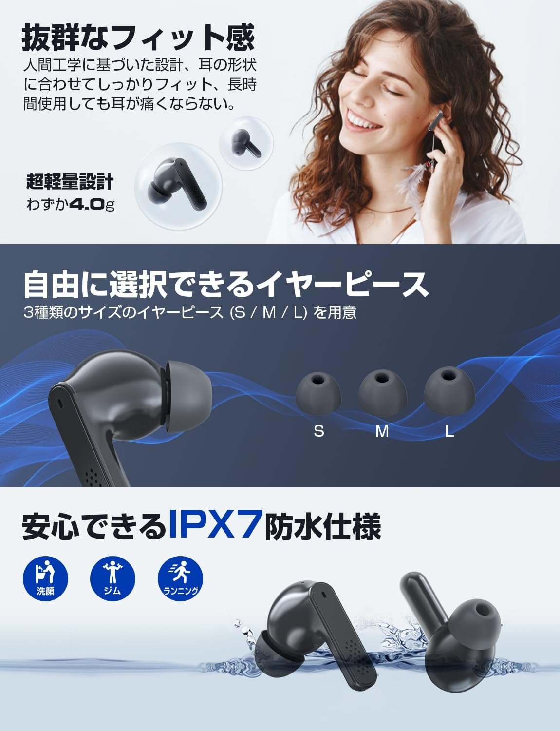 (快適に着用し、簡単な操作)耳にぴったりです。柔らかいシリコンの耳の先端の3つのサイズは、カスタムフィットと素晴らしいシールを提供します。耳ごとにわずか0.1オンス(4 g)の超軽量デザインは、耳の負担を最小限に抑え、耳に長い間着ることさえ忘れることができる自然で快適な着用体験を保証します。また、非常に敏感なタッチセンサーが装備されているため、プレイしたり、一時停止、曲、バックソングを調整したり、ボリュームを調整したり、職場や学校、スポーツ、ジムなどの通勤など、どんな状況でも長い間音楽を楽しむことができます。