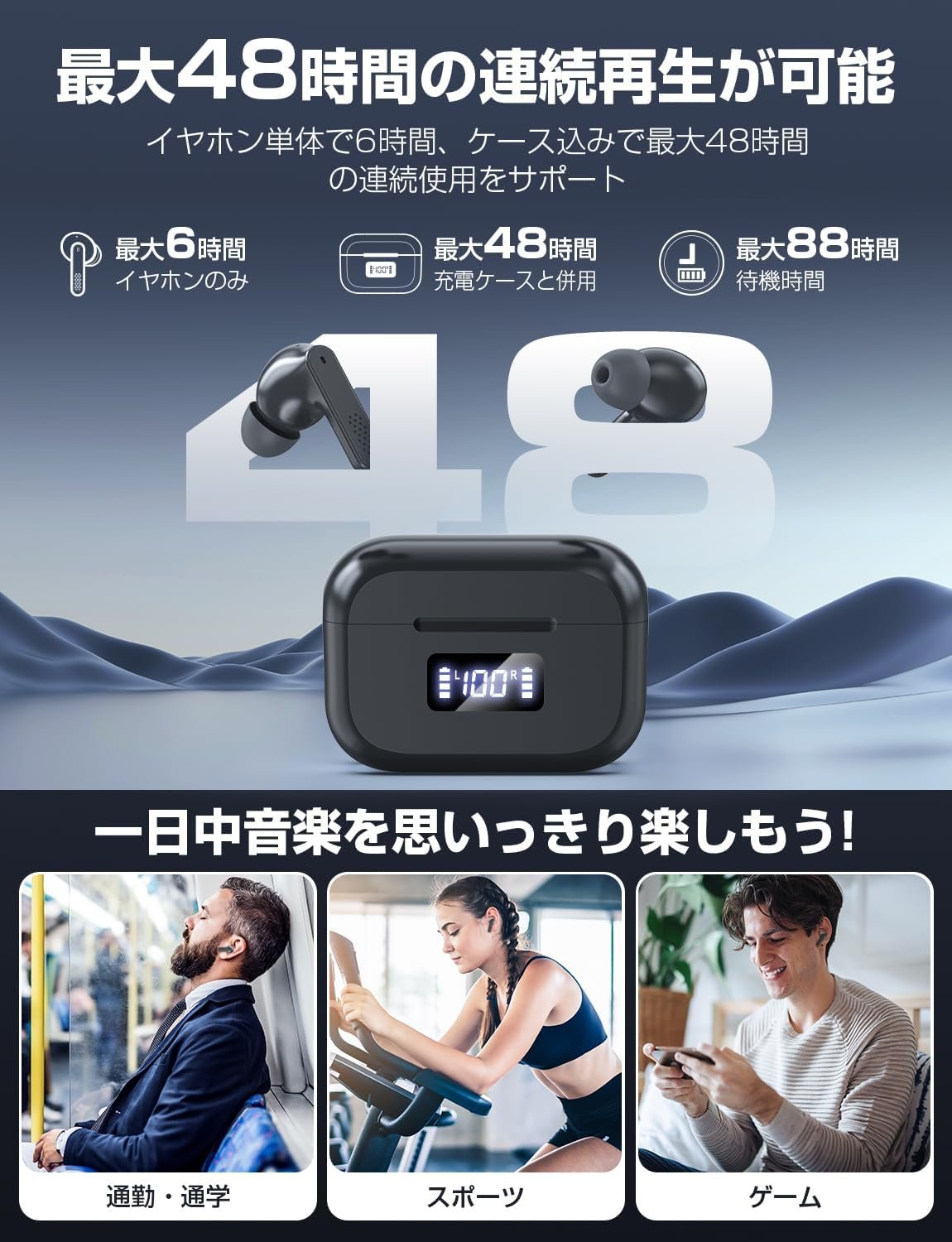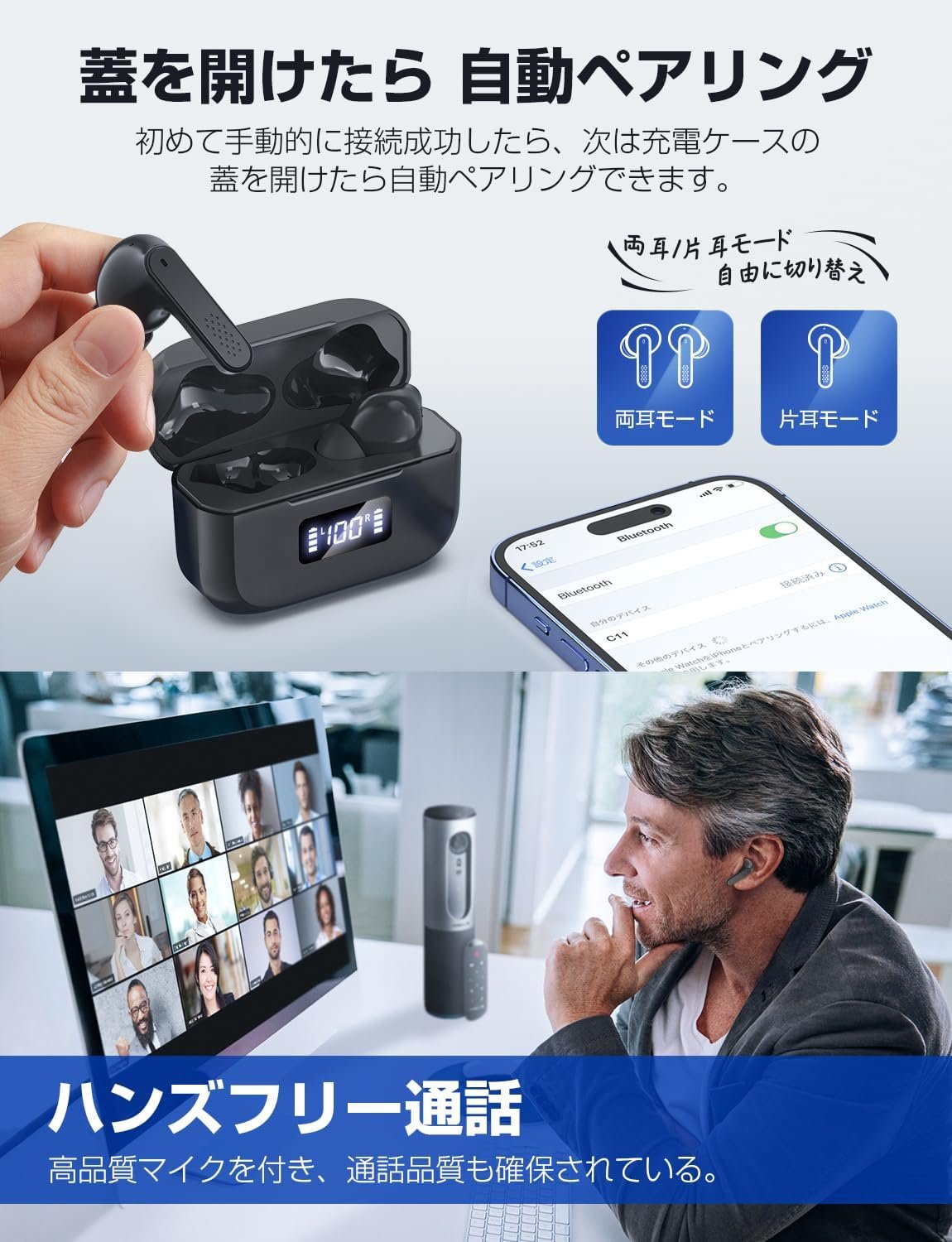 朝から夜までの音楽をお楽しみください。この製品は大幅に改善されており、イヤホン自体だけで6時間継続的に実行でき、最大48時間充電できます。毎日の通勤や職場や学校や短い出張などの長い旅行中にも、快適かつ安全に使用できます。瞬時にペアリングテクノロジーを装備し、Bluetoothイヤホンとペアリングしたら、すぐにデバイスに接続できます。イヤホンを開閉するだけで、片方または両方の耳モードを簡単に切り替えることができます。さらに、切り替え時に音楽を停止する必要はなく、スムーズに変更できます。ワイヤレスの自由をお楽しみください!