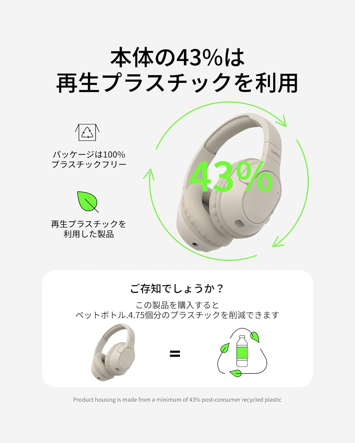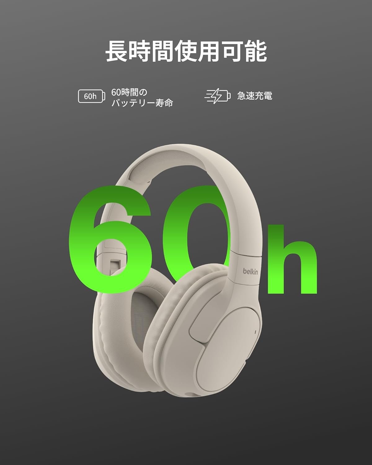 Belkin SoundformサラウンドAud009Jasa Bluetooth 5.4ワイヤレスヘッドフォンが組み込まれているワイヤレスヘッドフォン、マルチポイント接続、最大60時間の音楽再生、折りたたみ可能なカップ、軽量、5.5オンス(156 g)、