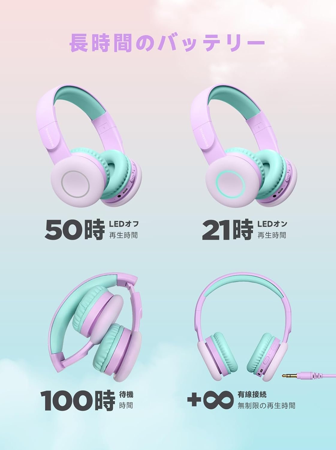 85 dBのボリュームは、通常の学習環境での子供の聴覚を保護できます。94dBのボリューム制限があり、大きなヘッドフォンは飛行機の騒音や長距離車の騒音に対してより良いです。LEDライトボタンを押して、85dBと94dBのボリュームを切り替えます。
