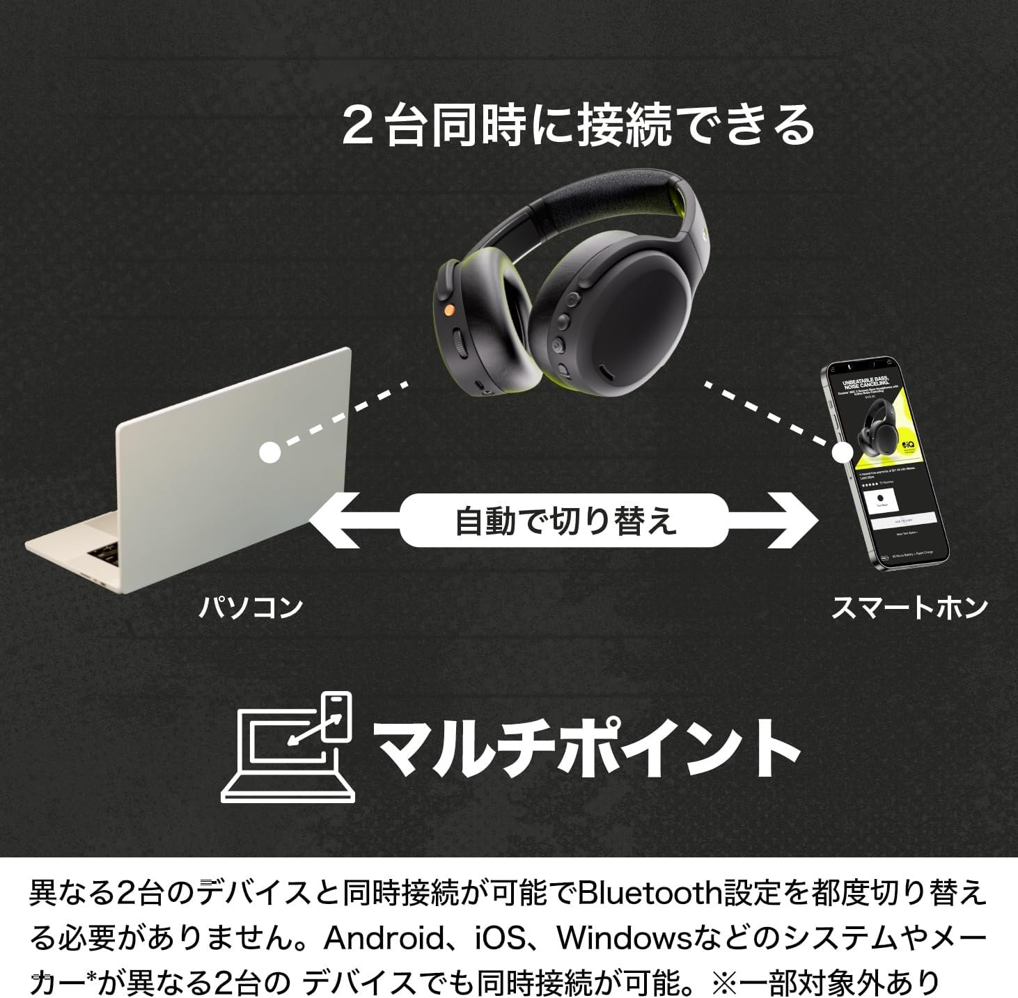 マルチポイント:2つの異なるデバイスと同時に接続でき、毎回Bluetoothの設定を切り替える必要はありません。 PCムービーを見ながら接続されているスマートフォンに接続されたスマートフォンへの着信コールを自動的に切り替えたり、スマートフォンで音楽を聴いているときに同時に接続されているPCでのWeb会議を自動的に切り替えます。 Android、iOS、Windowsシステムなど、さまざまなメーカー*システムを持つ2つのデバイスと同時に接続できます。場合によっては使用できない場合があります