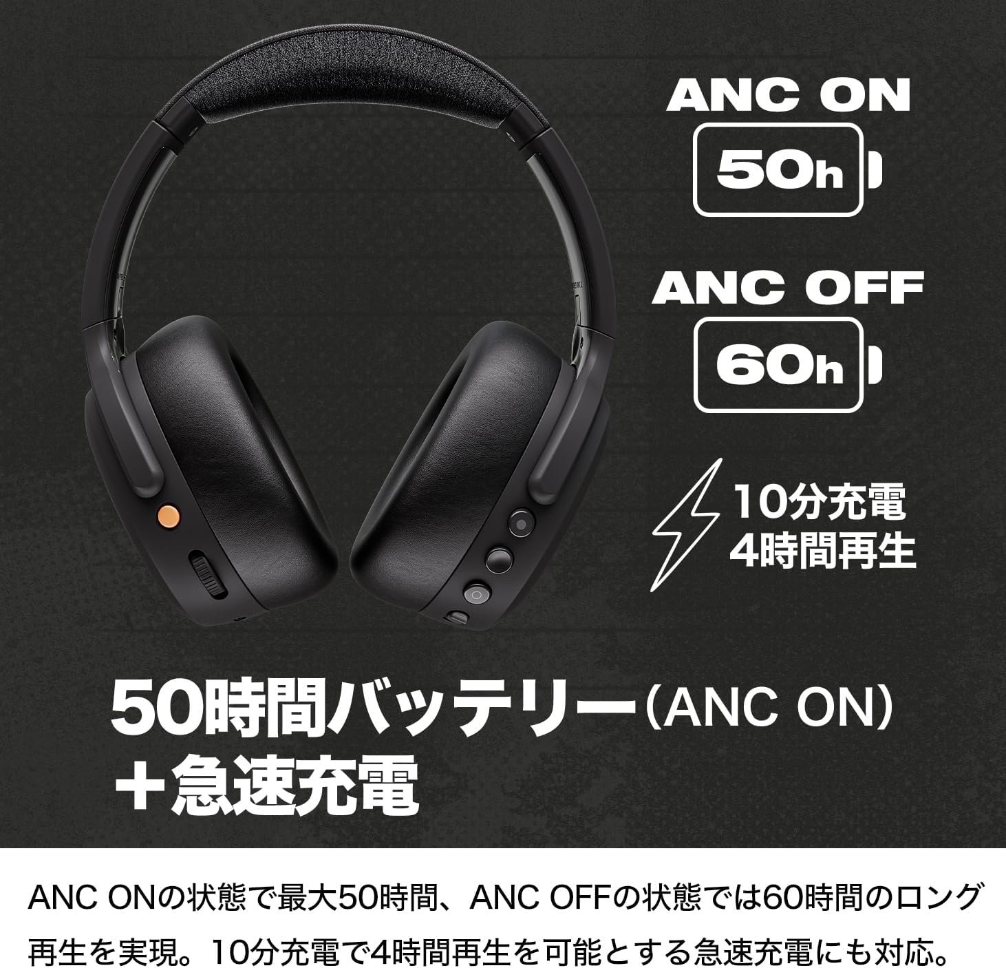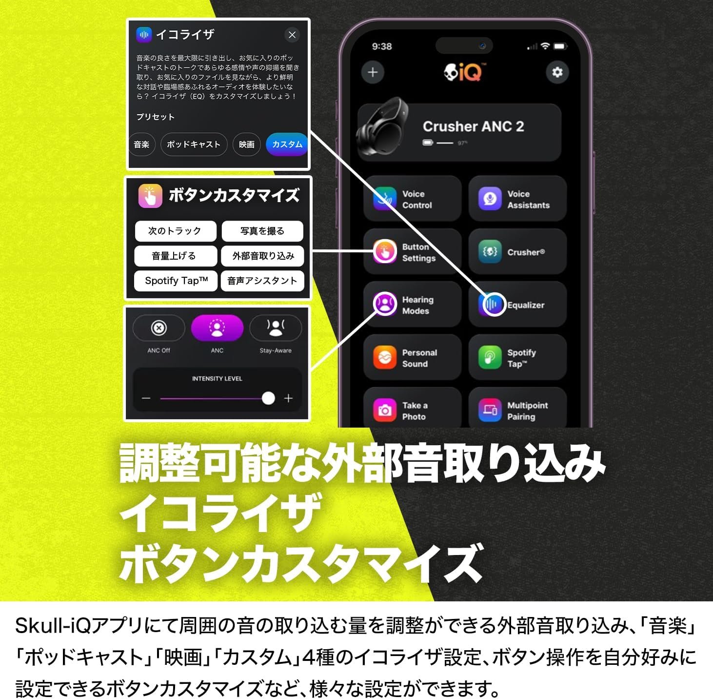 調整可能なアクティブノイズキャンセル:4つのマイクを装備したANCを装備し、それを装着した瞬間に、周囲のノイズを解放し、静かで快適な世界を提供します。 ANCの強度を新しいアプリで調整し、アンビエントノイズリングの境界に最適に設定できます。クラッシャーANC 2のANCは、周囲のノイズをブロックするだけでなく、ヘッドフォン内で振動し、透明なトレブルとパワフルなベースサウンドを生成するクラッシャーベースの残響も排除します。