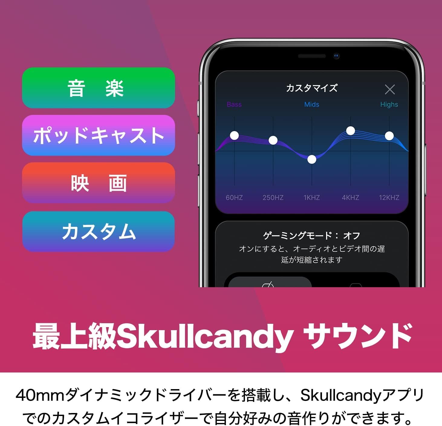 40mmのダイナミックドライバーは、印象的なSkullcandy SoundyouがSkullcandyアプリのカスタムイコライザーで独自のサウンドを作成し、音楽に浸ることもできます。