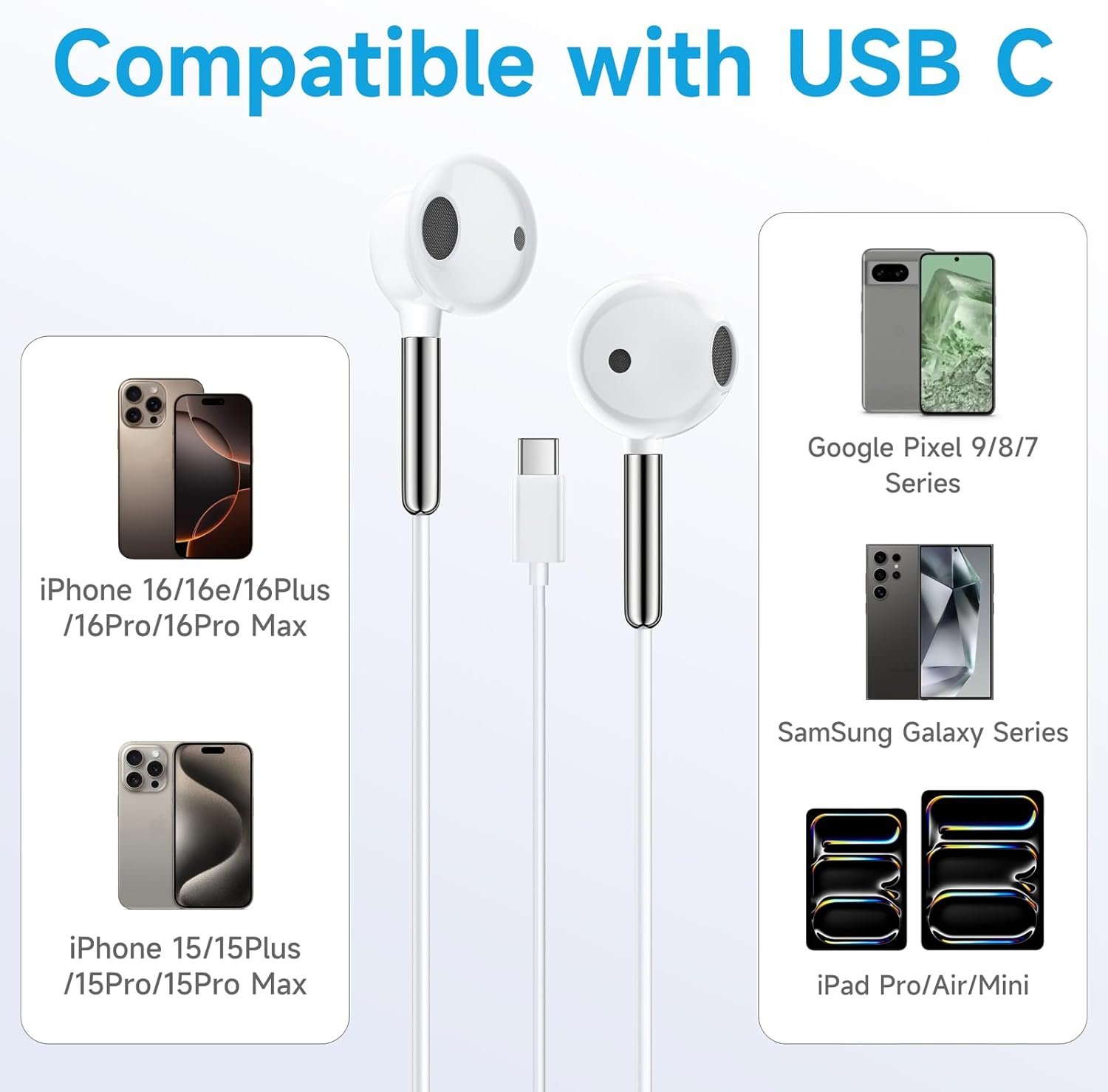 【一本の優れた互換性】Apple iPhone16/16e /16 plus/16 pro/16 pro max、iPhone15/15 plus/15 pro/15 pro max、iPad Proシリーズ、Samsung Galaxyシリーズ、Pixel Series、その他のUSB Cオーディオポートを備えたデバイス用にずっと接続されたUSB Cイヤホン。