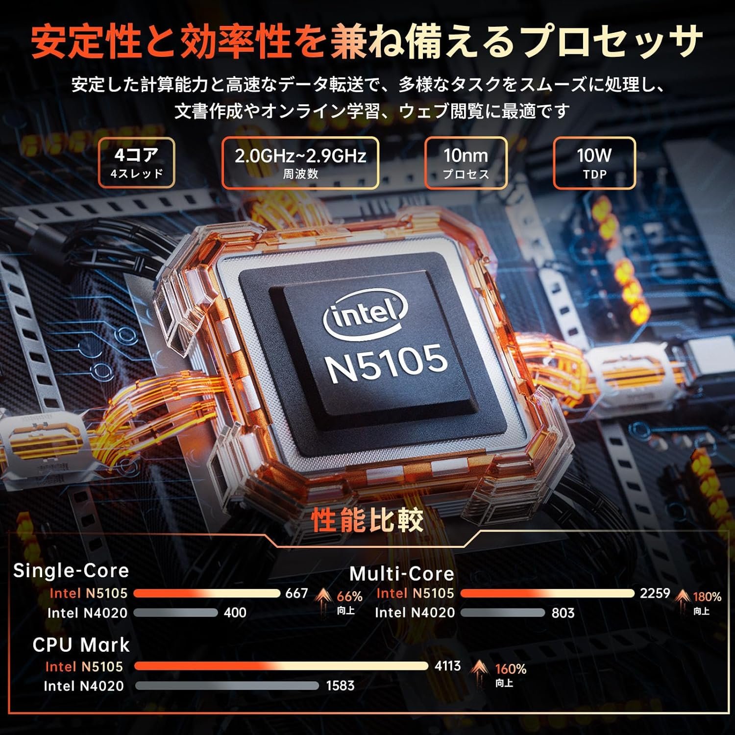 強力なIntel CPU、高速SSD:Intel N5105プロセッサ(最大2.9 GHz、4コア4スレッド)を装備して、Intel N100ラップトップクラスに匹敵する処理パフォーマンスを提供します。日常の仕事やワードやエクセルなどのマルチタスクのために、セレロンN5095と比較して処理速度を劇的に向上させます。組み込みのGPU Intel UHDグラフィックス、それはビデオを見たり、オフィスで働いたりするのにも理想的です