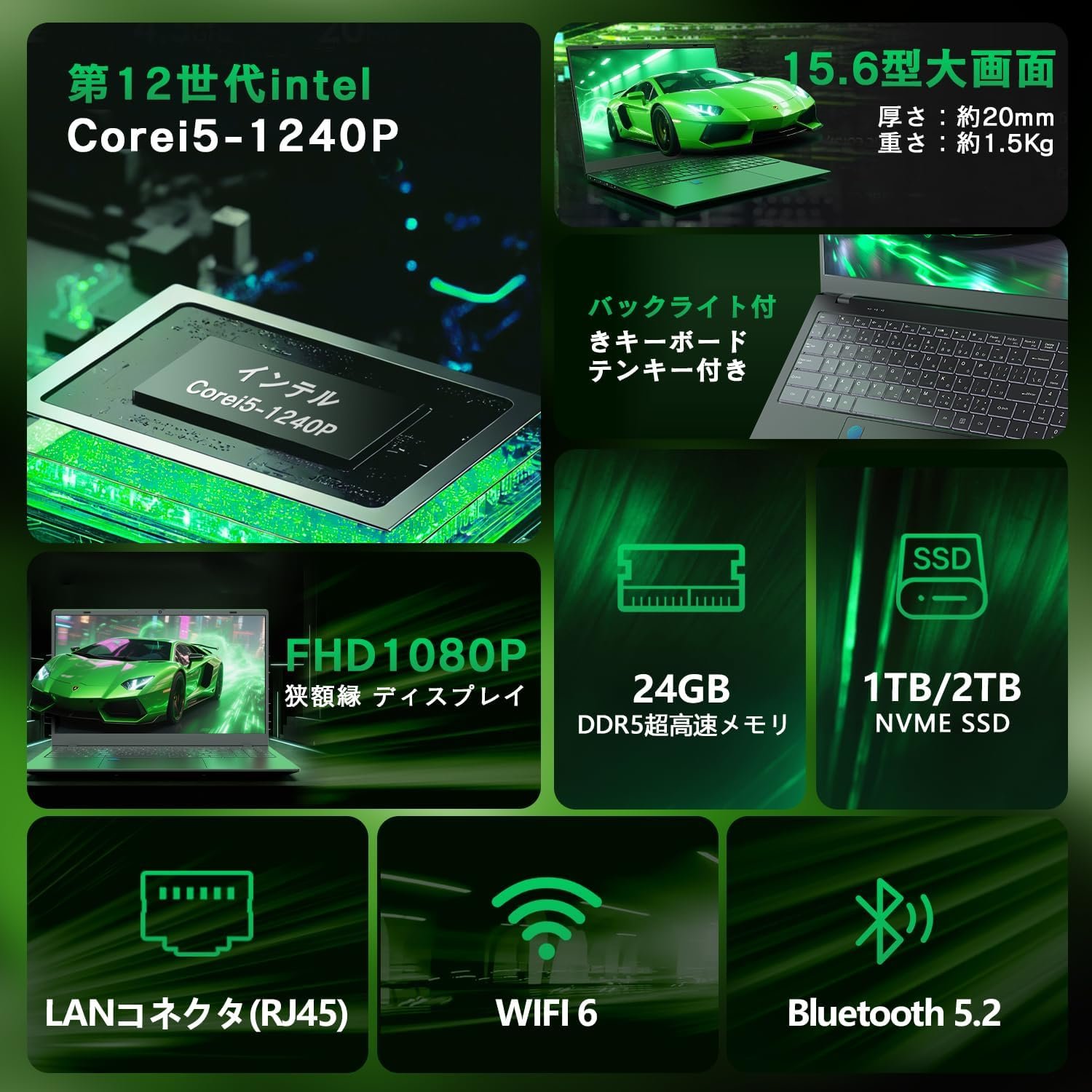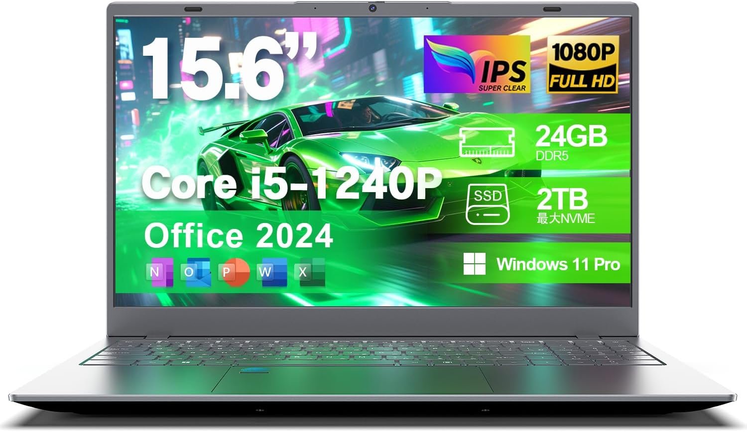 VETESA ノートパソコン Core i5 1240P 15.6 インチ Office2024 搭載、最大 4.4 GHz、12 コア、DDR5、24GB、2TB、NVMe SSD、Windows11、FHD1080P、Web カメラ、高速 WiFi6、Type-C、HDMI、テンキー、指紋認証