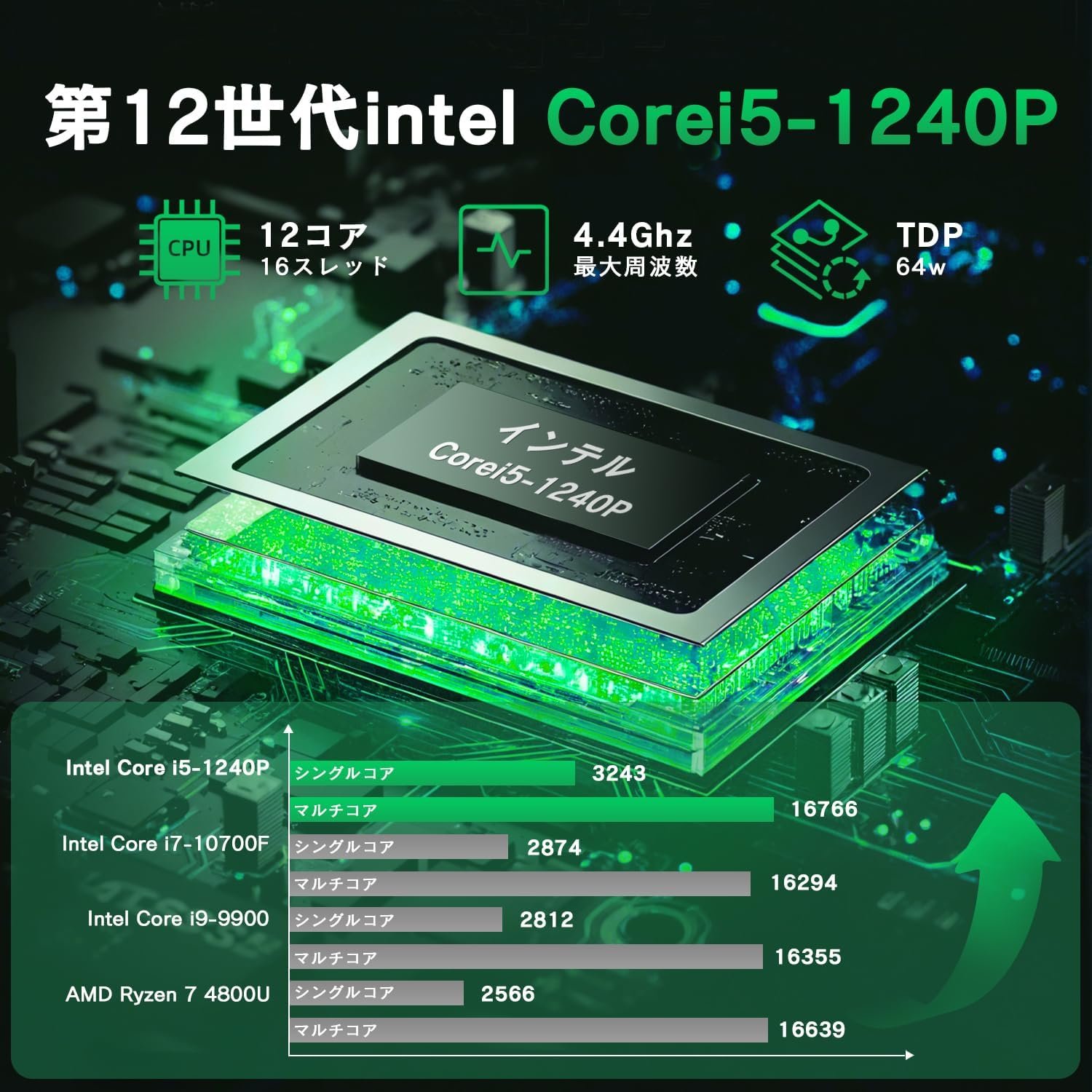 高性能で効率的な作業体験:デスクトップパフォーマンスのためのCPU Core i5 1240P、DDR5 32GBの大容量メモリを搭載このコンピュータは、ゲームと複数のタスクを同時に実行でき、データ処理とプログラミングアプリケーションをサポートし、MS Officeなどのオフィスアプリケーション、Webブラウジング、スムーズな表示のための高解像度ビデオとストリーミングコンテンツ、基本的なビデオ/画像編集などを含む、あらゆる状況で優れたパフォーマンスを提供します。