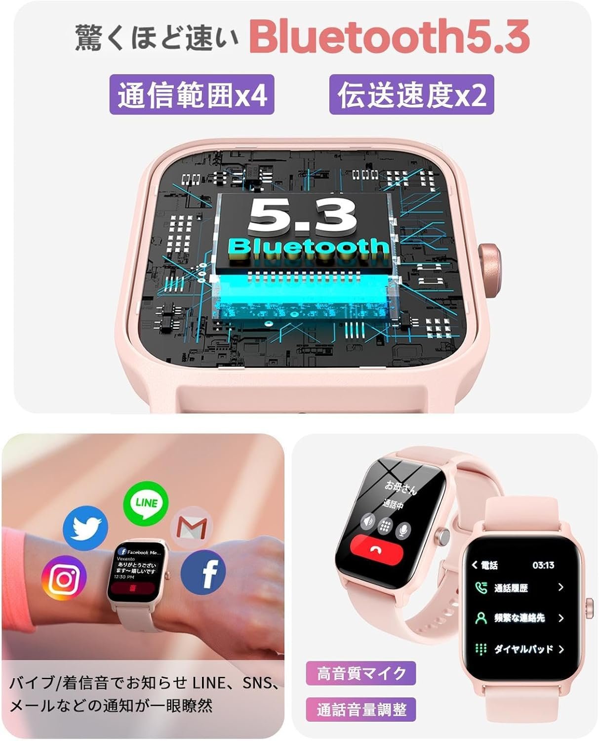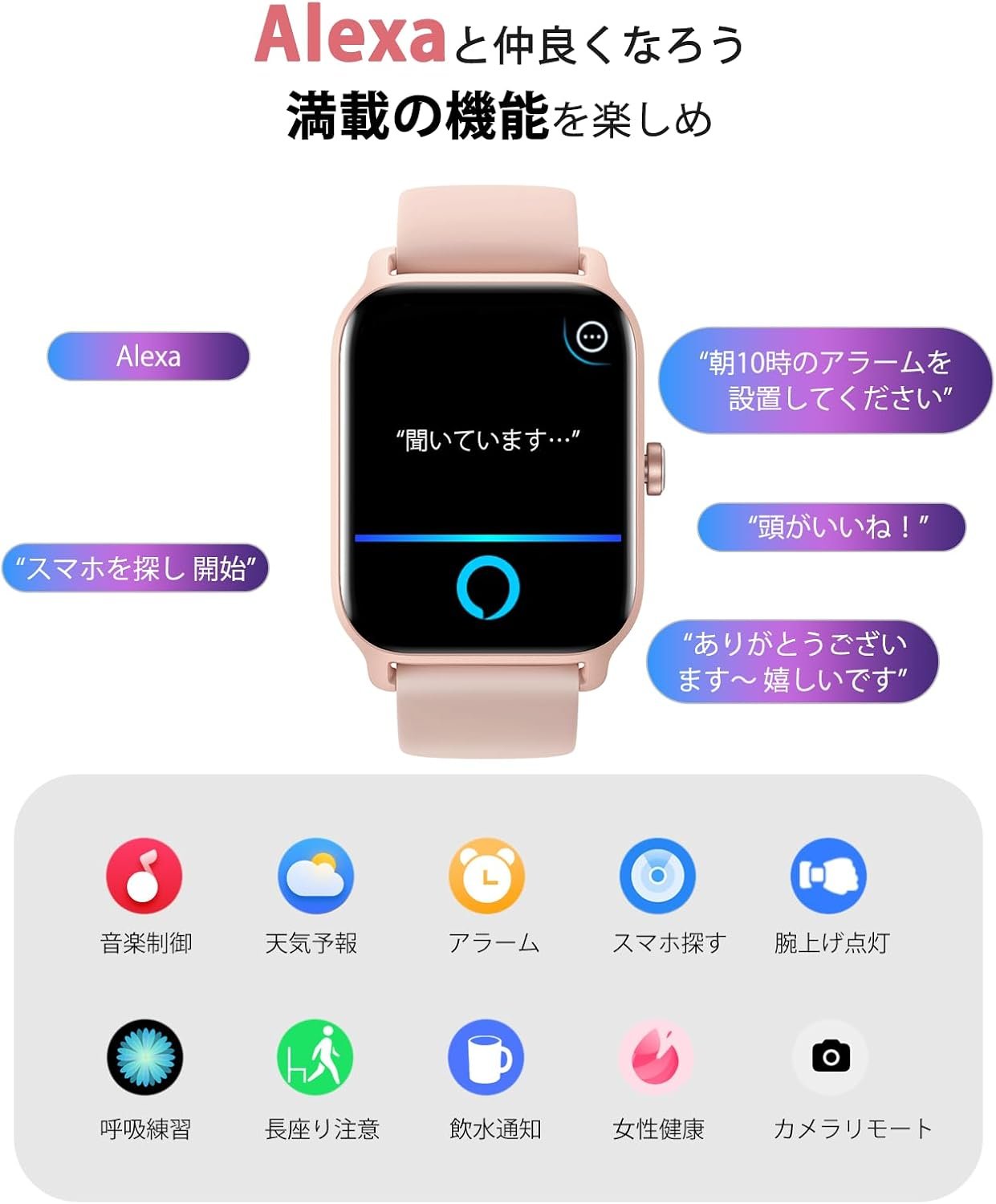 スマートウォッチ、コール機能、Alexa互換、Android互換、iPhone互換、2024イノベーション、Bluetooth 5.3、1.8インチ大画面、着信通知、IP68防水、アクティビティ