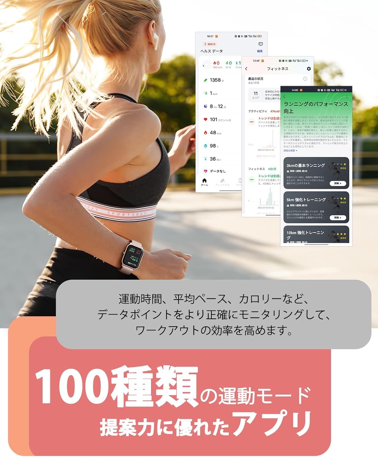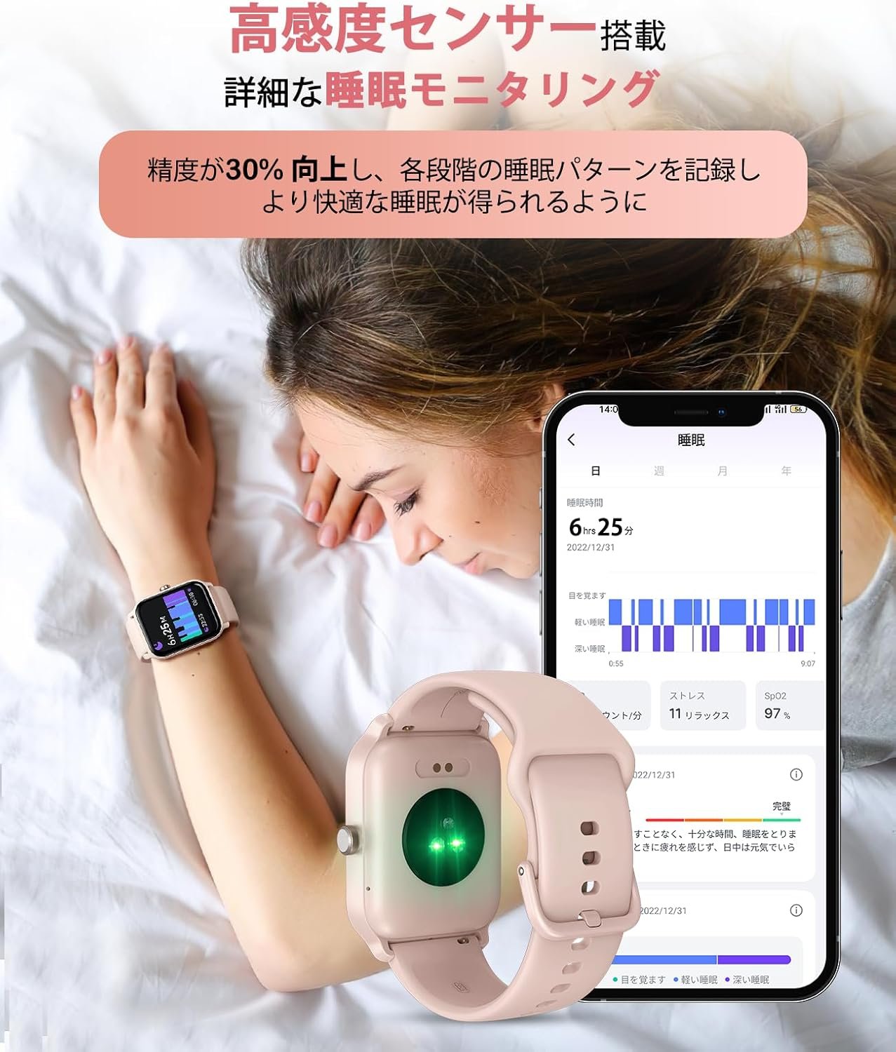 24時間の健康管理 / 100を超える異なるエクササイズモード:センサーの精度が30%増加するため、手首からデータを簡単に取得して、健康を理解できるようになります。睡眠監視機能はアップグレードされて、睡眠の質を視覚化するために、深い睡眠、軽い睡眠、またはレム睡眠かどうかを検出します。ストレス管理、呼吸の練習、飲料水、座りがちなアラート、女性の月経コントロールなど、あなたの規律生活をサポートするためのアシスタントとして使用できます。サイクリング、登山、水泳、野球など、100を超えるワークアウトオプションから選択できます。また、ランニングやウォーキングなどの自動検出をサポートします。豊富なフィットネスデータを記録および監視します。セットの目標を完了すると、メダルを獲得し、達成感を感じ、それを手に入れるように動機付けます。この製品は医療機器ではありません。健康管理に使用し、ユーザー自体による測定に基づいて診断または治療しないでください