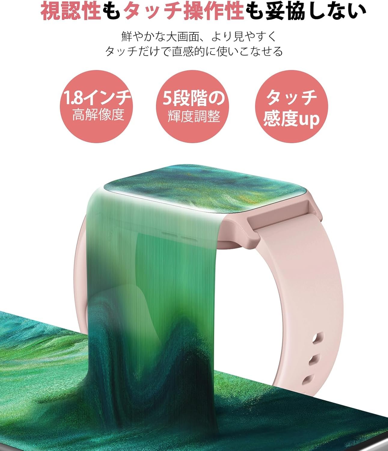 1.8インチの大画面 /ダイヤル:信じられないほど軽量1.4オンス(36 g)。スマートウォッチに1.8インチのカラフルなIPS TFT-LCD画面が装備されています。 5レベルの輝度調整により、昼夜を問わず高い視認性を維持できます。アプリからのさまざまなダイヤルから選択するか、愛する人やペットの写真を設定して、気分と調整に合わせてオリジナルの時計の顔を作成します。滑らかなテクスチャーを備えた穏やかな形をしているので、見やすく快適に着ることができます