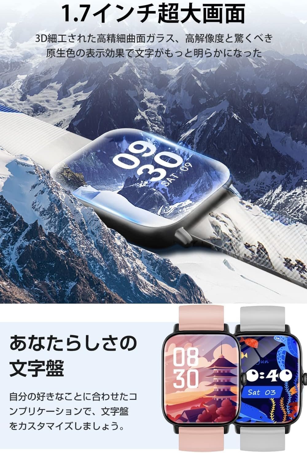 【1.7インチ大画面&多種類の文字盤】 この1.7インチ大画面スマートウォッチは、高解像度フルタッチスクリーンを採用し、より広い範囲な表示を実現。操作性も高く、画面の切り替えや通知の確認もスムーズ。iPhone・Android対応Bluetoothスマートウォッチとして、誰でも簡単に接続できます。クラシックからポップまで多種類の文字盤を内蔵し、気分やシーンに合わせて自由にカスタマイズ可能。として、仕事・運動・日常すべての場面で活躍します。